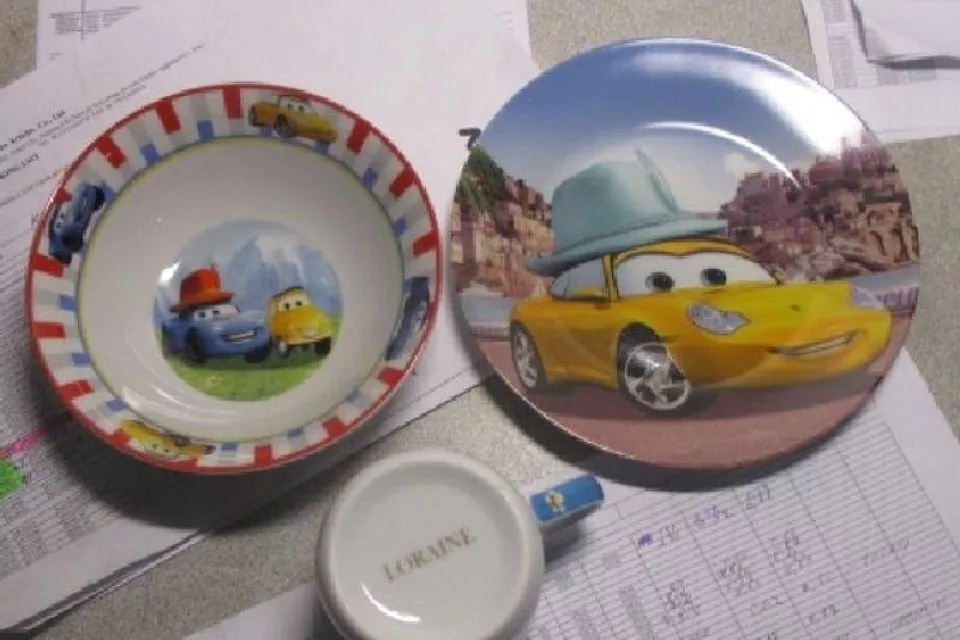 На детские тарелки и кружки были нанесены товарные знаки компании «Дисней Энтерпрайзис, Инк.» - изображения Спящей красавицы, Золушки и персонажей мультфильма «Тачки».
