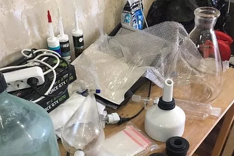 При обыске в лаборатории было обнаружено около 4 кг N-метилэфедрона, 20 литров мефедрона в жидком состоянии в завершающей стадии производства. Изъято промышленное оборудование, около 500 литров химических реактивов, предназначенных для производства порядка 50 кг различных видов наркотических средств.