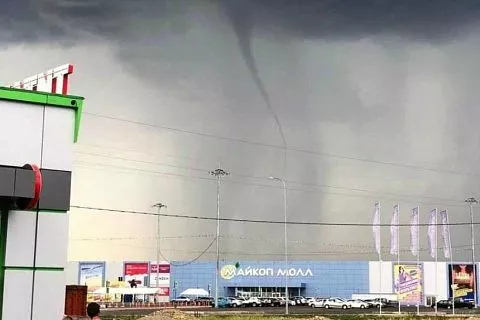 Жители Майкопа наблюдали несколько смерчей, после чего на город выпал крупный град. Очевидцы выложили в социальные сети фотографии градин размером с перепелиное яйцо.