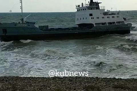 В Краснодарском крае из-за сильного ветра села на мель баржа (видео)