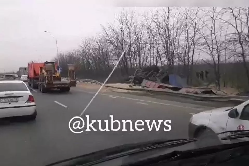 Появилось видео с места ДТП под Краснодаром, где опрокинулся зерновоз