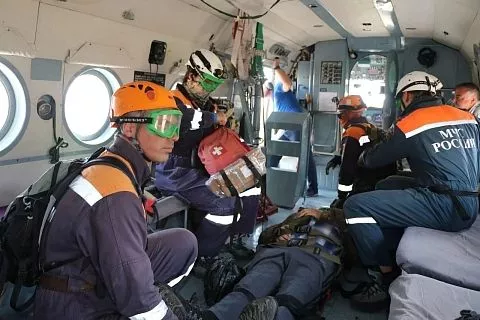 Вертолетом Ми-8 МЧС России спасатели эвакуировали 67-летнего мужчину на носилках из балагана на борт воздушного судна. Медик ЮРПСО оказала пострадавшему доврачебную помощь.
