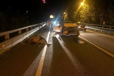 По предварительным данным, водитель автомобиля «Мицубиси» при движении допустил наезд на животное, которое двигалось по проезжей части дороги во встречном направлении. В результате ДТП водитель и пассажир автомобиля не пострадали, сообщает отдел пропаганду ОГИБДД УВД по Сочи.