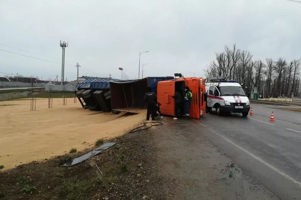 В Краснодарском крае перевернулся КамАЗ с зерном. Пострадал водитель