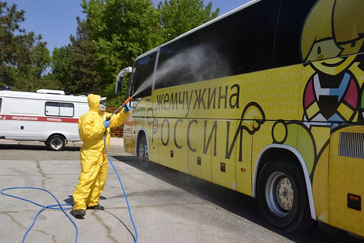 Уже завершены ремонтные работы, проведена дезинфекция спальных корпусов, производственных помещений, вентиляционных систем, а также узлов водоснабжения и отопления. Осталось только завершить обработку территории и спецтехники. Специалисты в защитных костюмах тщательно распыляют дезраствор по аллеям, тротуарам и игровым площадкам. Отдельное внимание – автобусу, который будет привозить детей в детский оздоровительный комплекс и, по окончании их смены, увозить назад на вокзал.