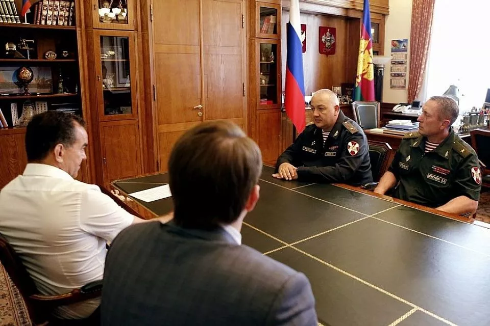 Первый заместитель командующего Южным округом войск Нацгвардии РФ Евгений Меркушин представил губернатору Краснодарского края Вениамину Кондратьеву нового начальника Главного управления РФ по Краснодарскому краю Георгия Медоева.
