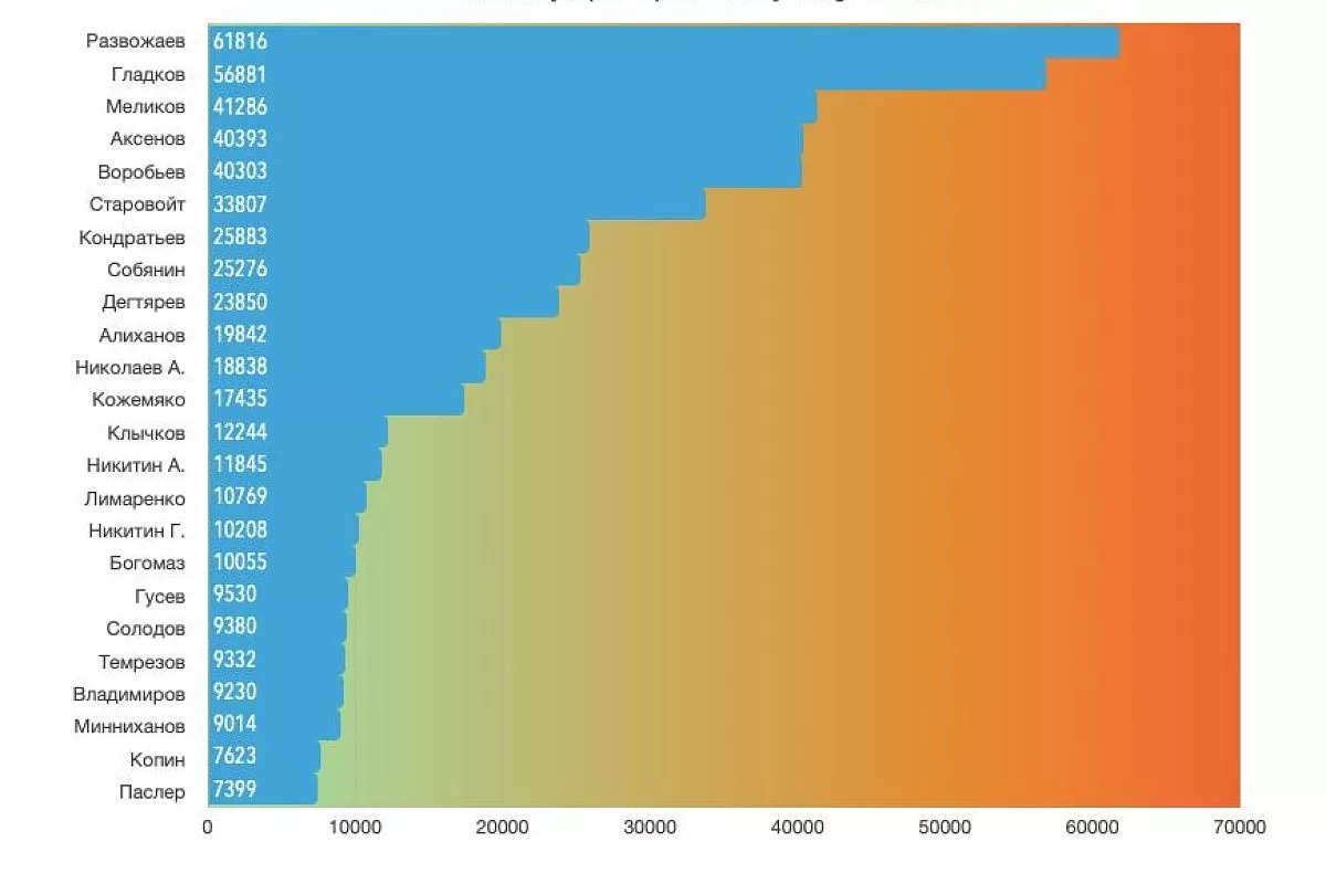 На первой строчке в топе губернаторов оказался глава Севастополя Михаил Развожаев с весом 62 тысячи.