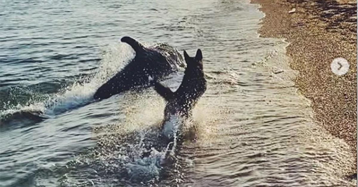 В свою очередь, дельфин не испугался бурной радости своего нового четвероногого товарища и спокойно продолжил заниматься своим любимым делом - ловить хамсу возле берега.