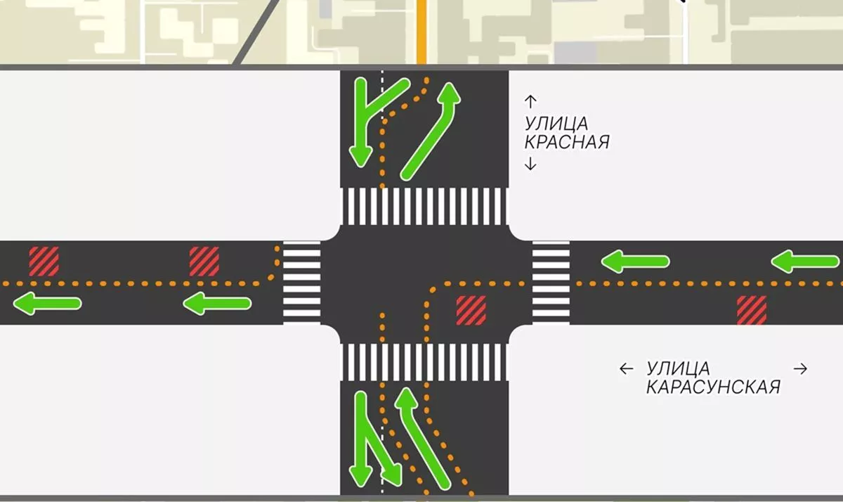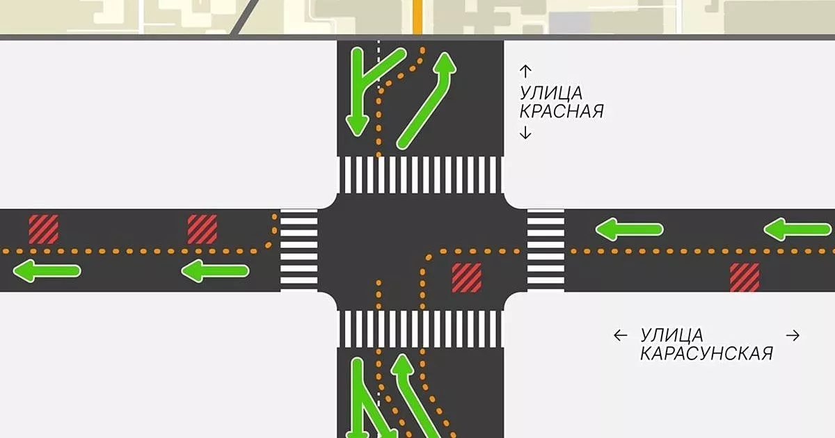Уточняется, что при движении по Карасунской от Красноармейской до Красной для проезда перекроют левую полосу. От Красной до Рашпилевской нельзя будет двигаться по правой полосе. На перекрестке Красной и Карасунской проезжую часть сузят до одной полосы в каждую сторону. Транспорт по направлению к «Авроре» будет перестраиваться на встречную полосу, объезжая место работ, а после возвращаться обратно.