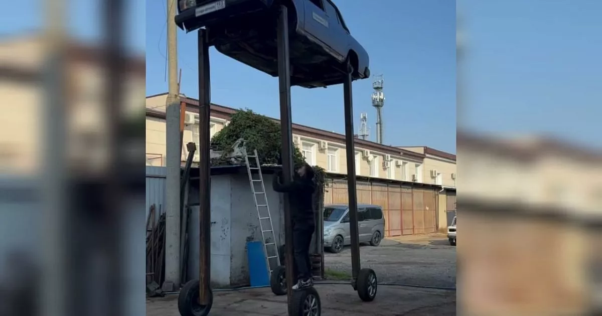 Своим подписчикам он предложил отгадать, на какую высоту ему удалось поднять легковушку.