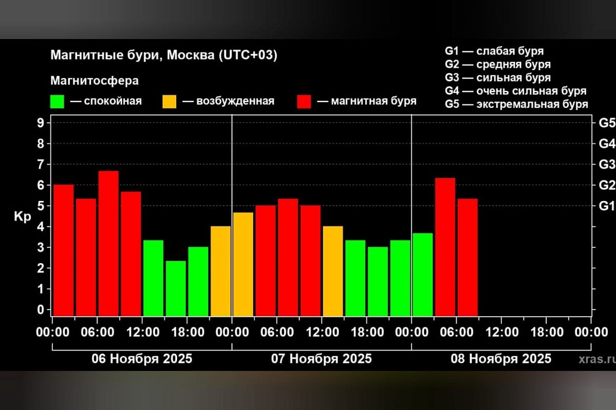 - В целом, за последние трое суток, с 6 по 8 число, наблюдались (и все еще наблюдаются) самые сильные бури более чем за месяц. Последнее схожее событие было 1-3 октября 2025 года. В то же время, количество зеленых вставок на графике ясно показывает, что все могло быть гораздо напряженнее, и событие прошло, в общем-то, по неожиданно благоприятному сценарию, - добавили в Лаборатории.