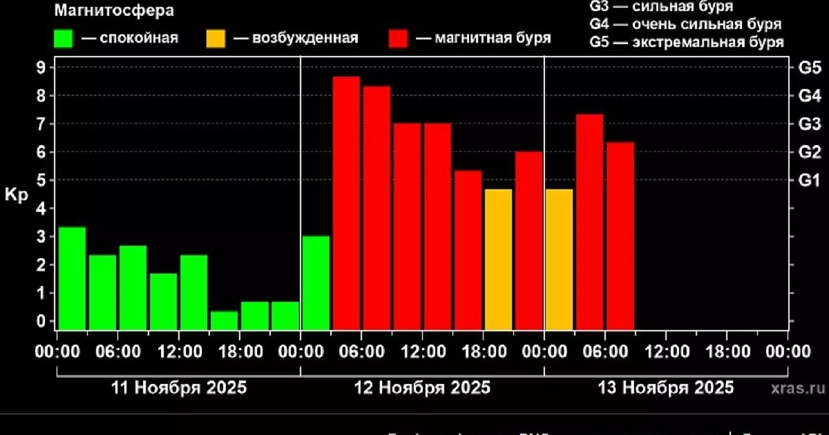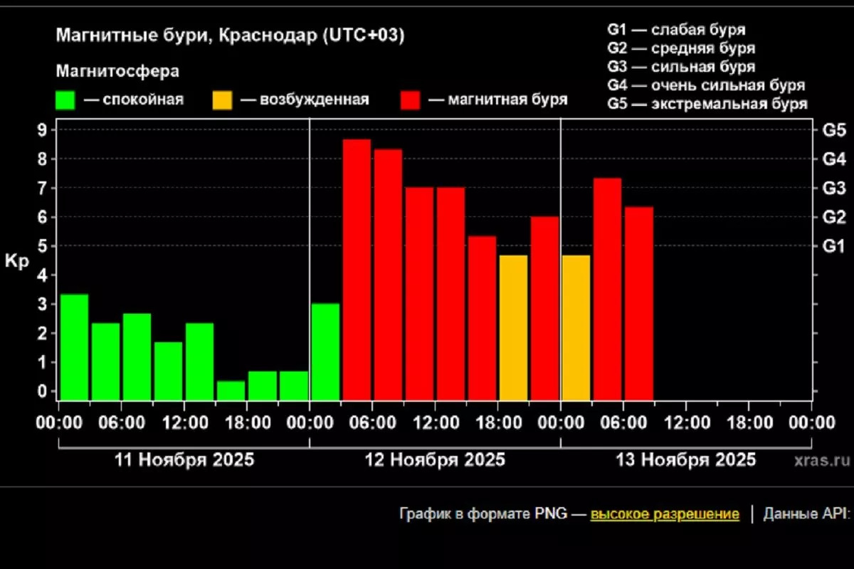 - По имеющимся на текущий момент данным, ожидается, что сильные и очень сильные магнитные бури, уровня G3-G4, продлятся на нашей планете в течение большей части сегодняшнего дня и лишь ближе к вечеру прекратятся. При этом полное прекращение возмущений геомагнитного поля и переход его в «зеленую» зону прогнозируется ближе к полудню пятницы, - сообщил ведущий синоптик центра погоды «Фобос» Михаил Леус.
