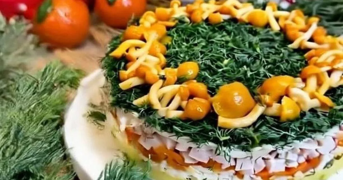 Этот салат — настоящее украшение стола. Он сочетает в себе сытность мясного блюда, свежесть овощей и пикантность грибов, а его нарядный вид создаёт праздничное настроение.