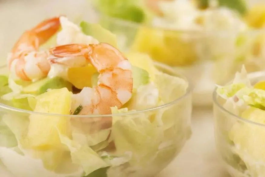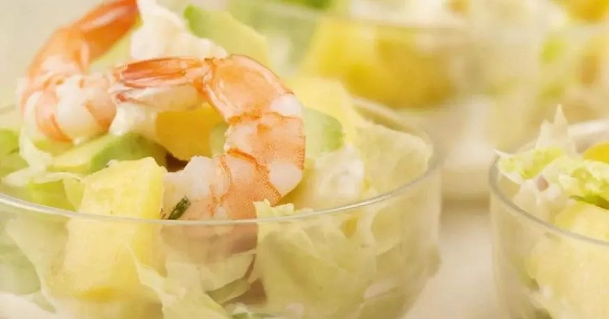 Сверху горкой разложите креветки, кубики ананаса и авокадо. Полейте всё мятным соусом прямо перед подачей, чтобы листья не размокли.