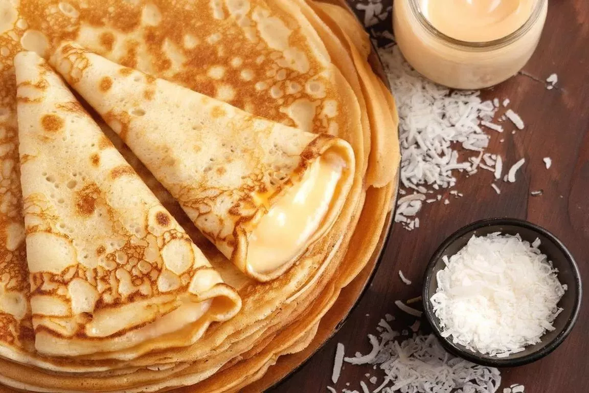 Рецепт необычных десертных блинов «Рафаэлло» с творогом и кокосом.