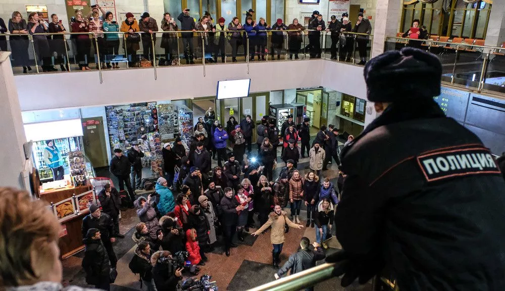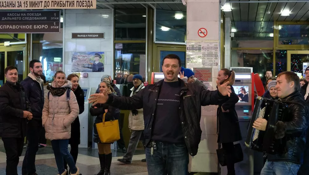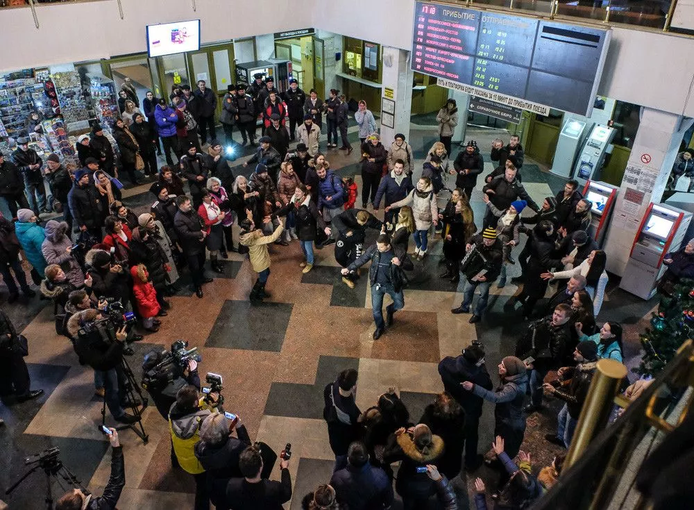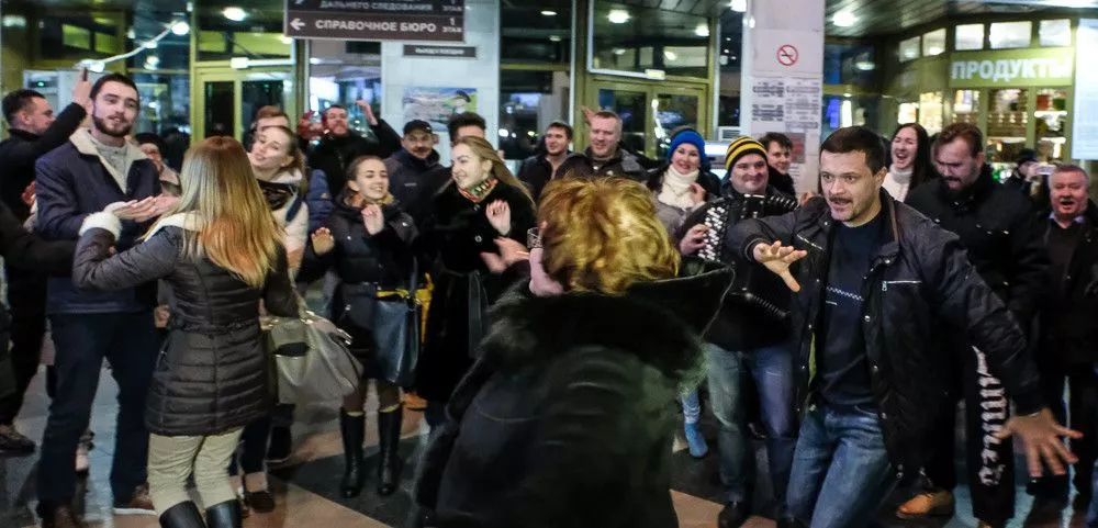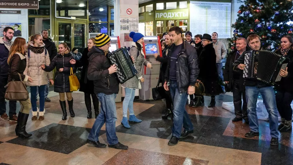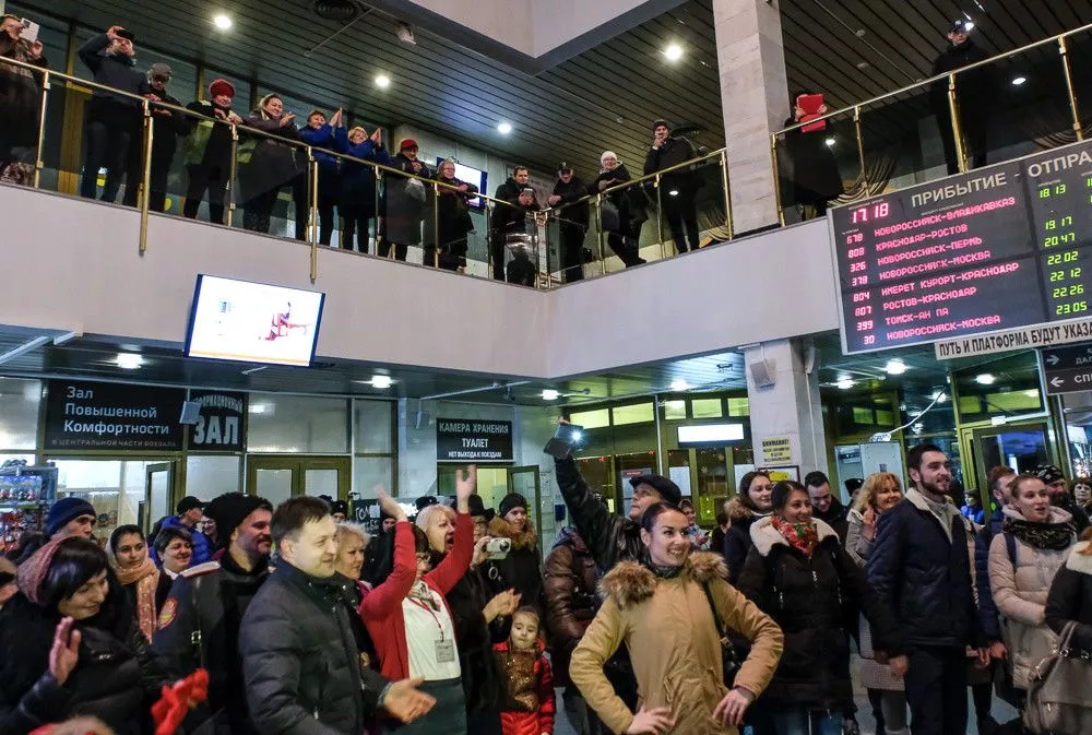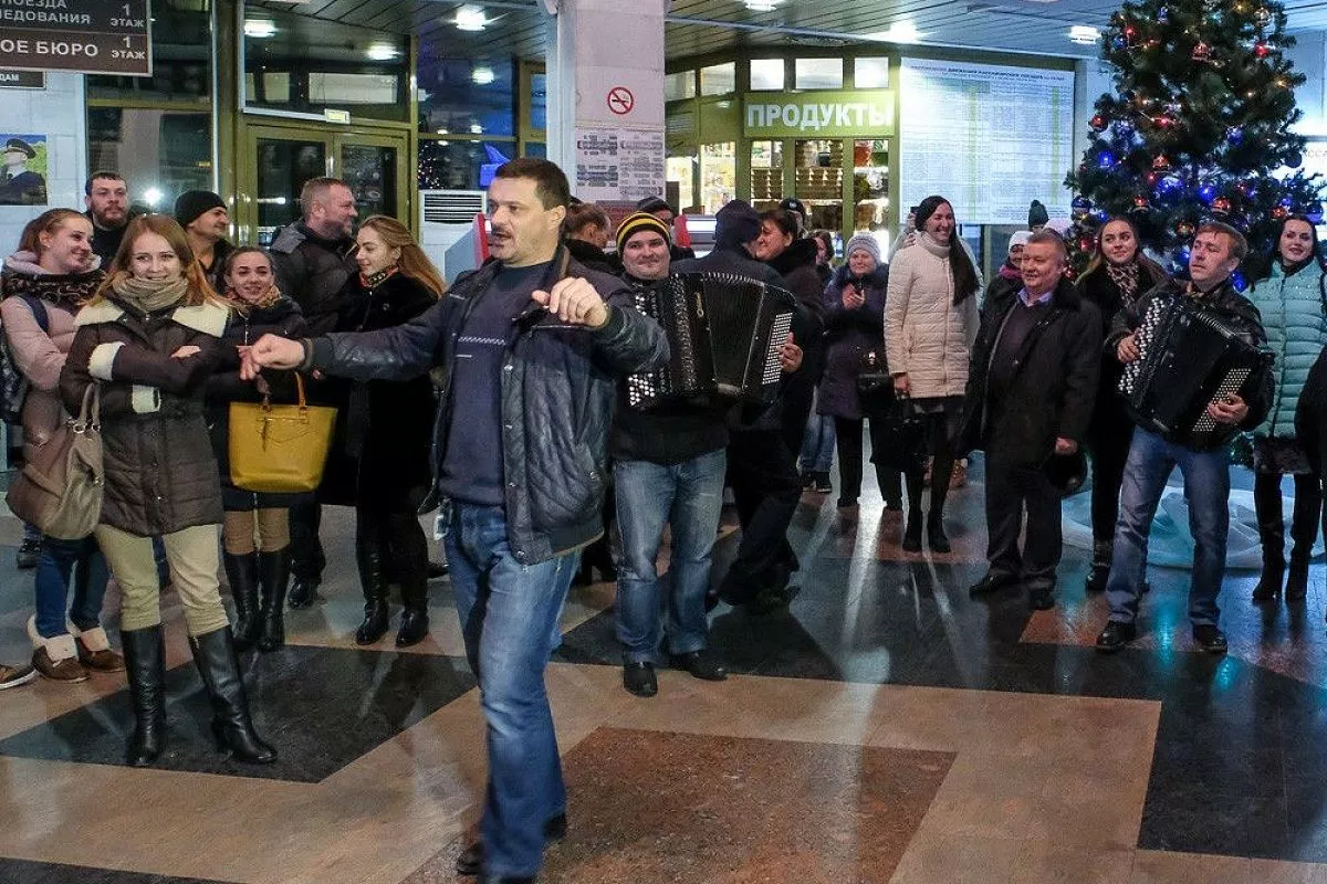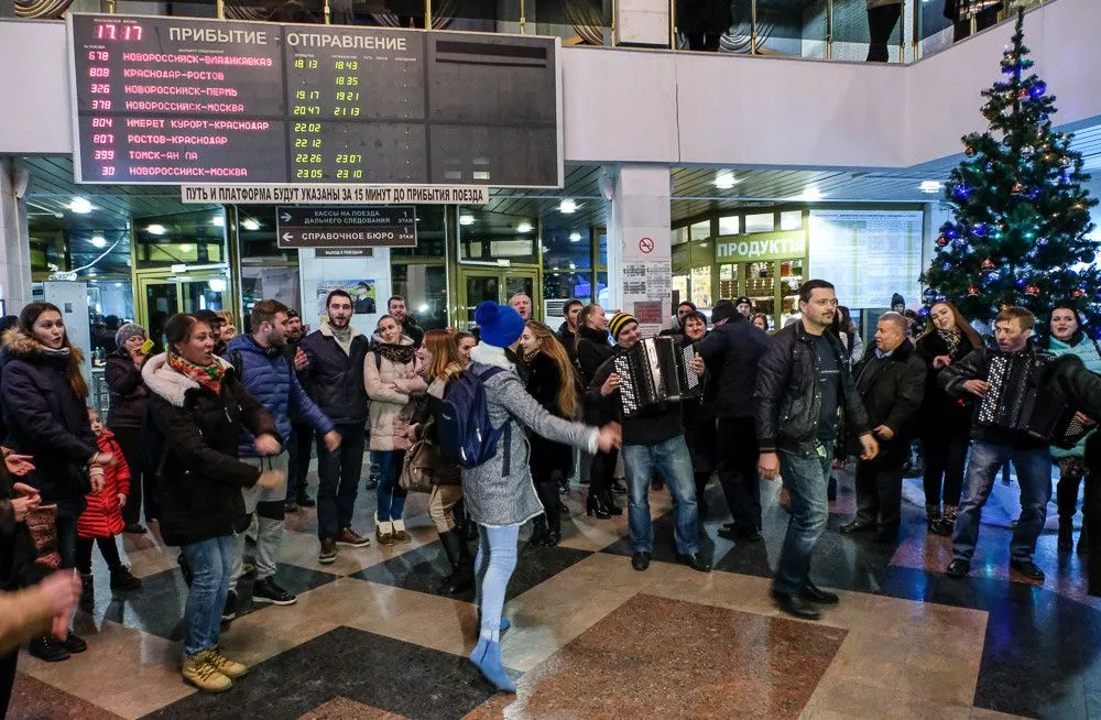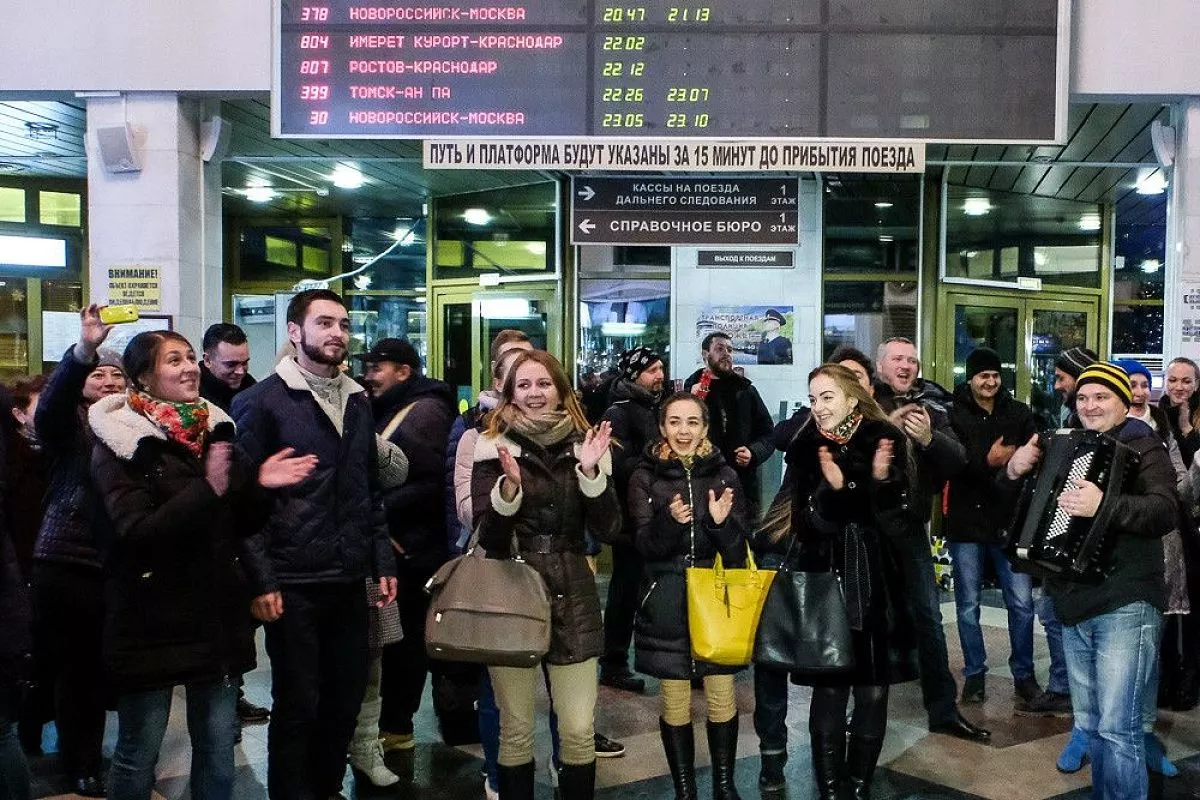 А сегодня в акции принял участие ансамбль казачьей песни «Криница», артисты исполнили песню «Нiч яка мiсячна...» на вокзале «Краснодар I».