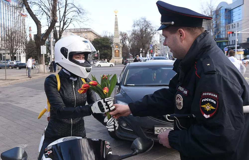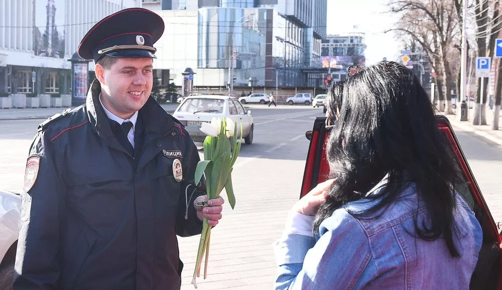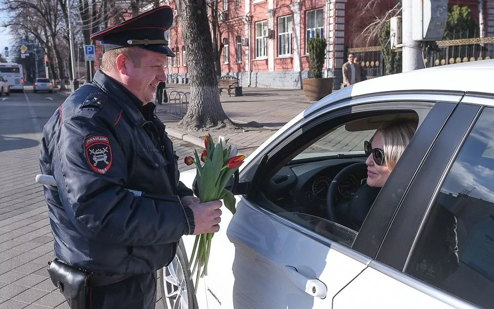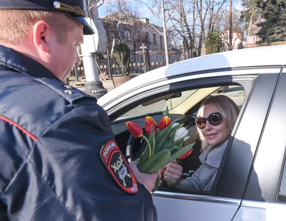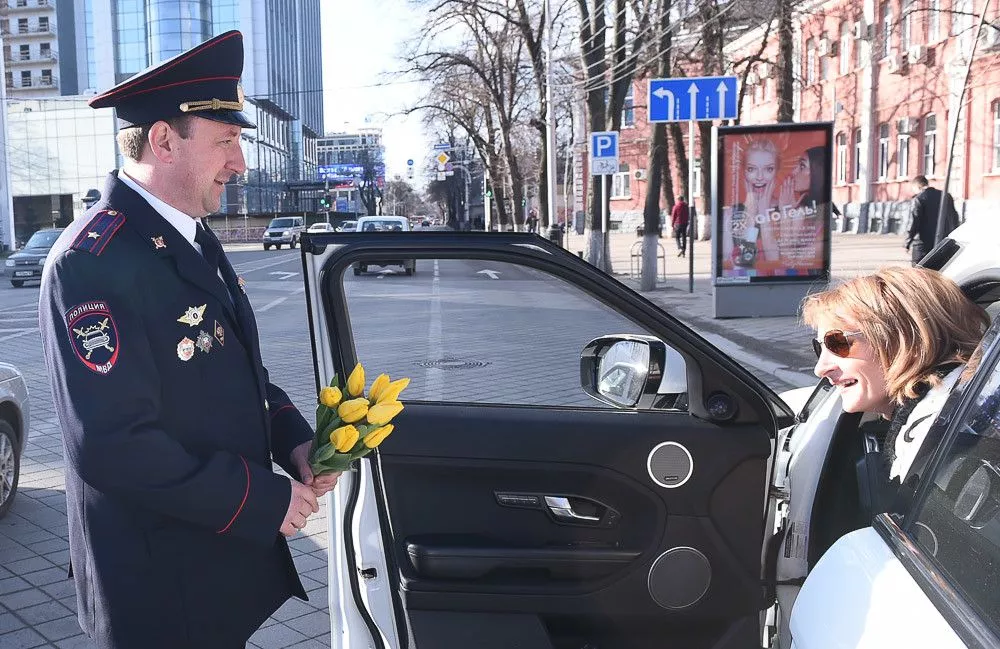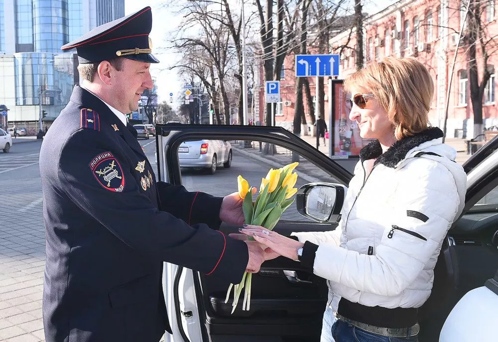 Сотрудники ГИБДД поздравляют краснодарских дам с наступающим праздником. Сегодня поздравили более 100 женщин. Фото Михаила Ступина.