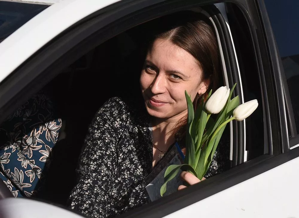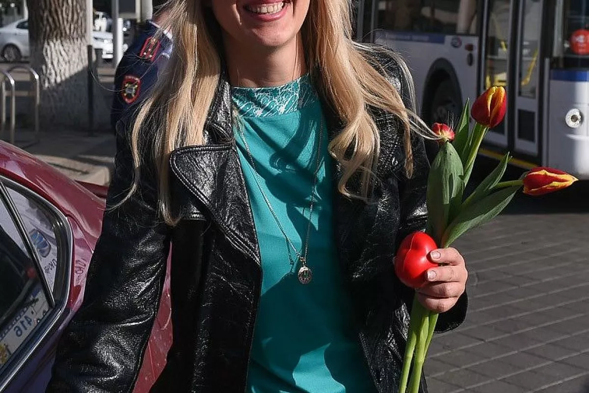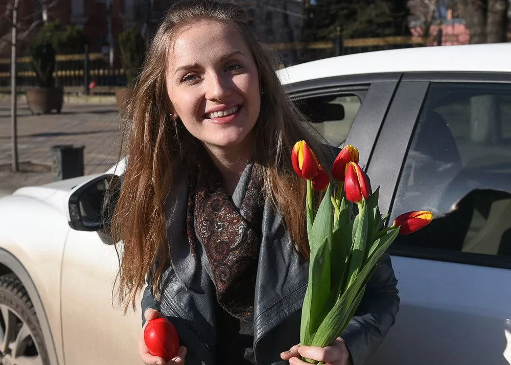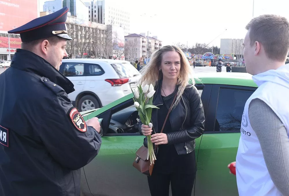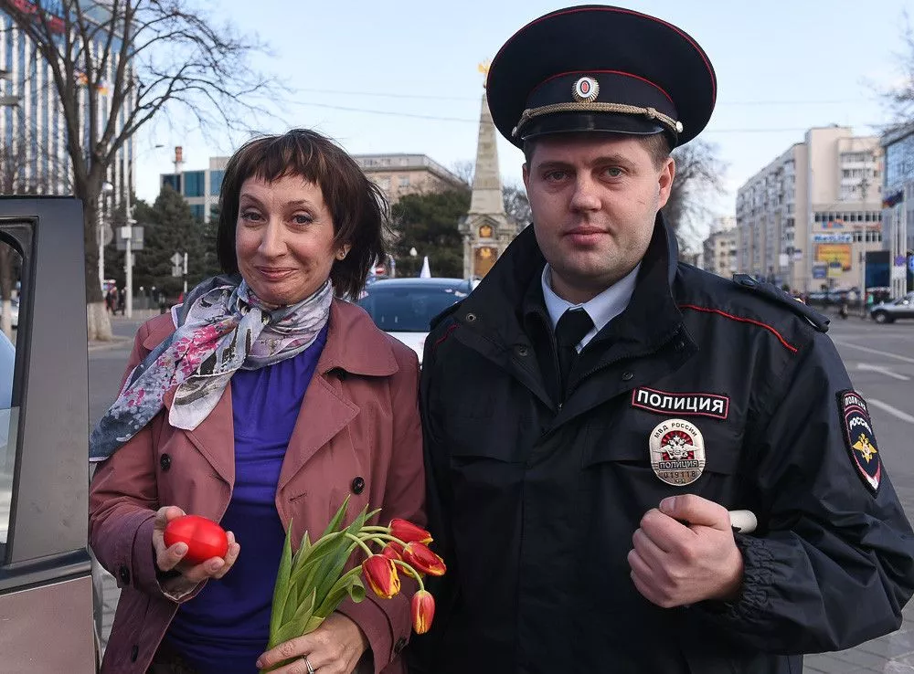 Сотрудники ГИБДД поздравляют краснодарских дам с наступающим праздником. Сегодня поздравили более 100 женщин. Фото Михаила Ступина.