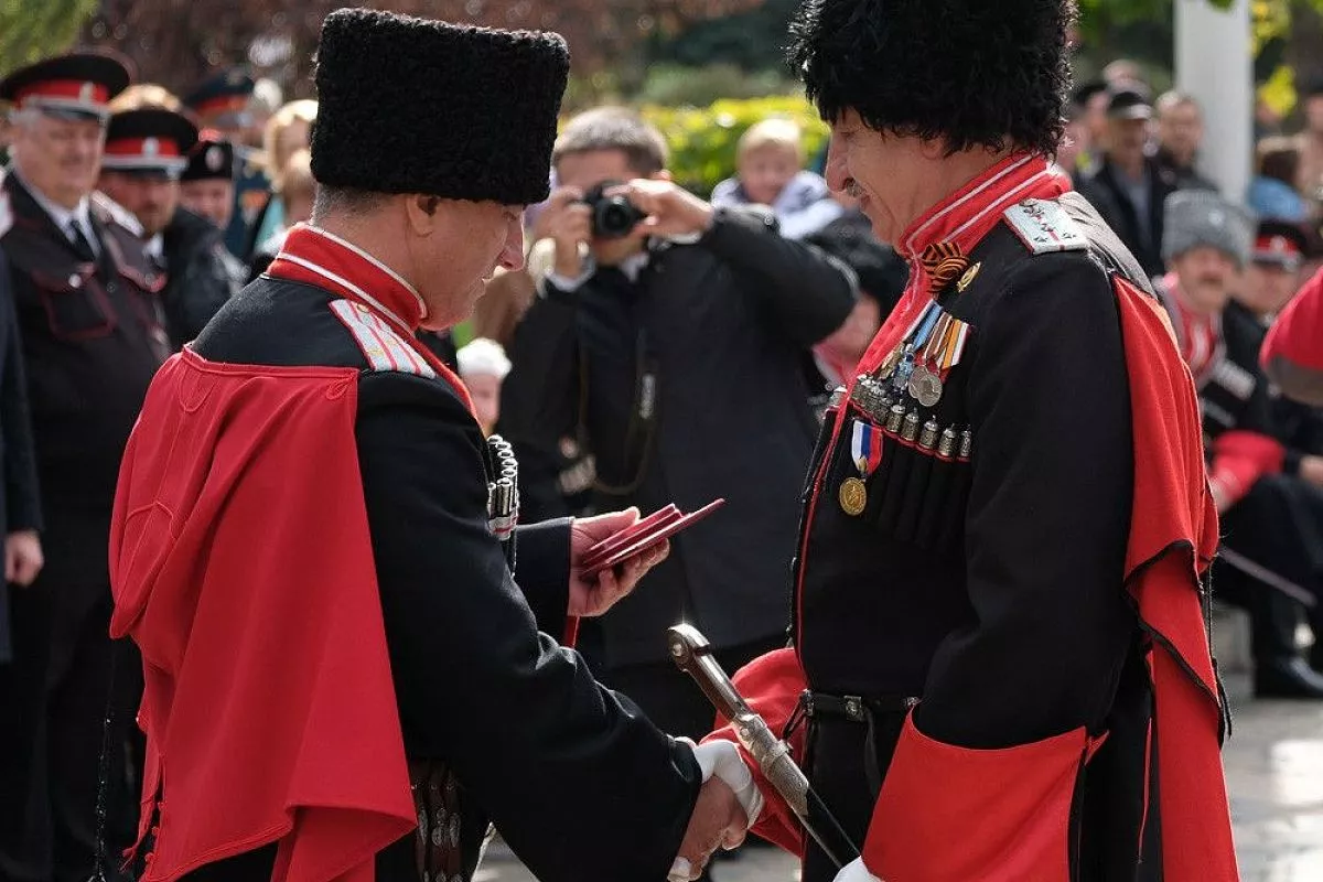 Отличившимся при несении госслужбы казакам вручили награды. После этого состоялось возложение цветков и венков к памятнику Екатерины Второй в честь казаков, погибших во время защиты отечества.