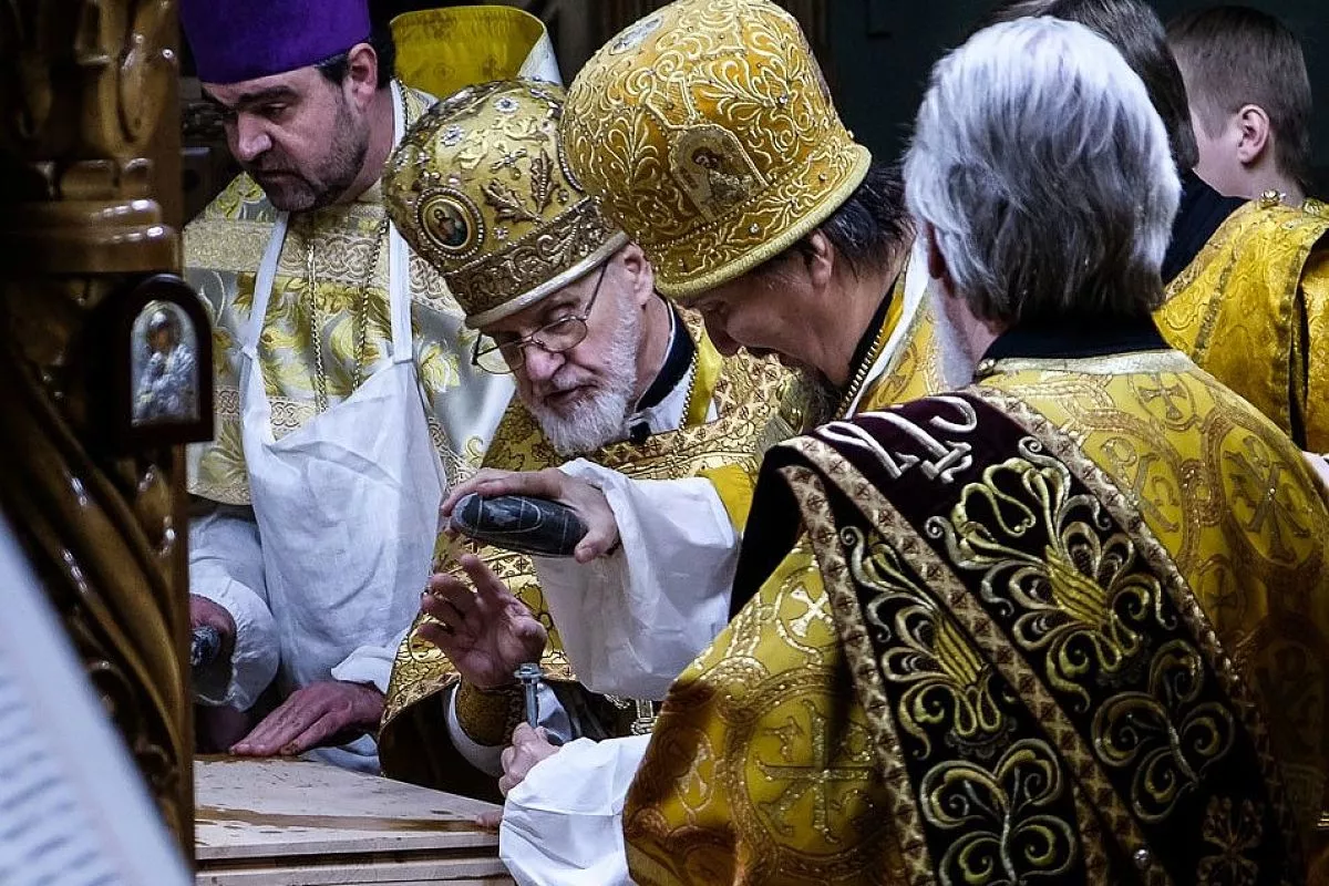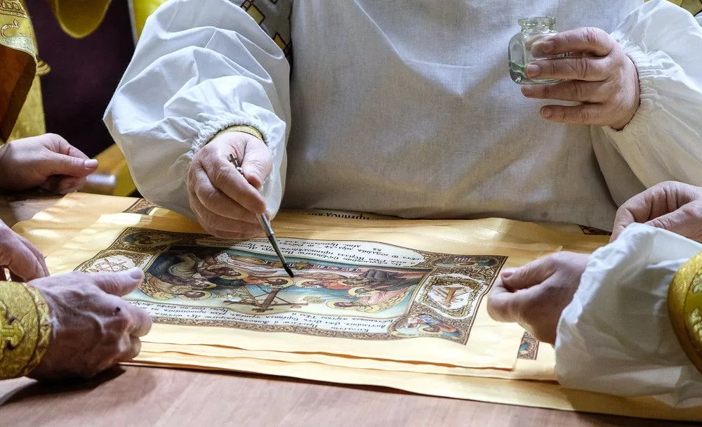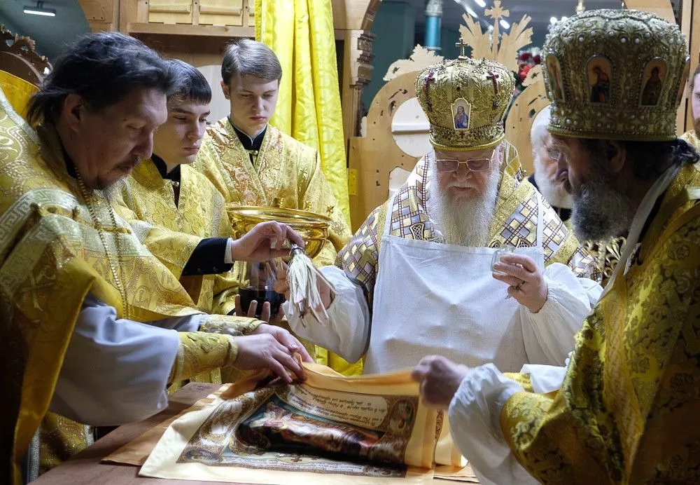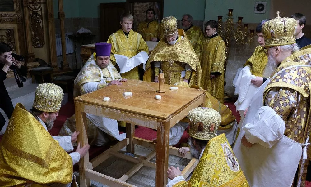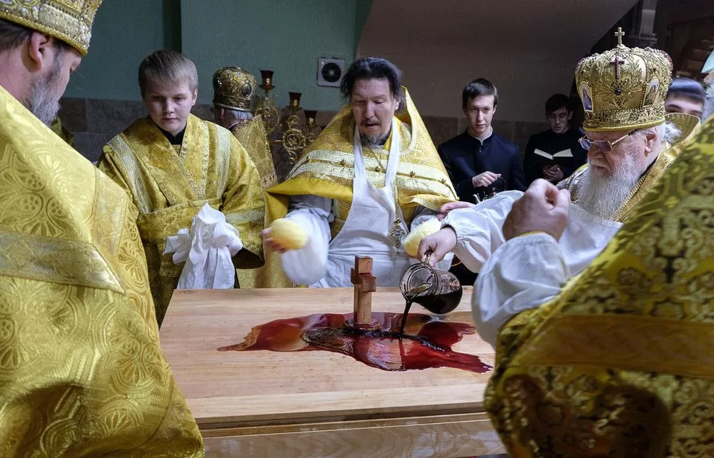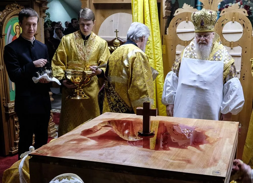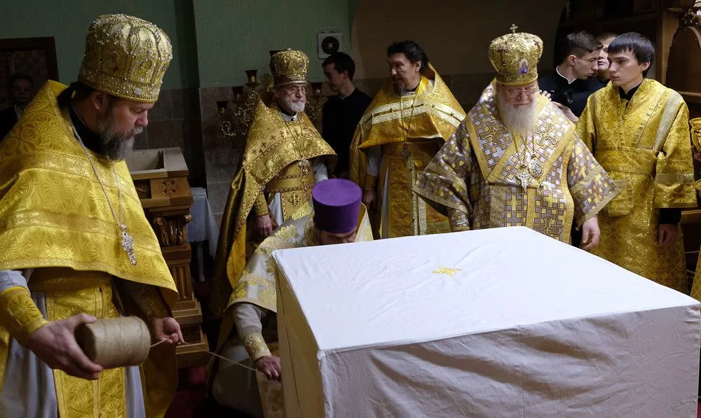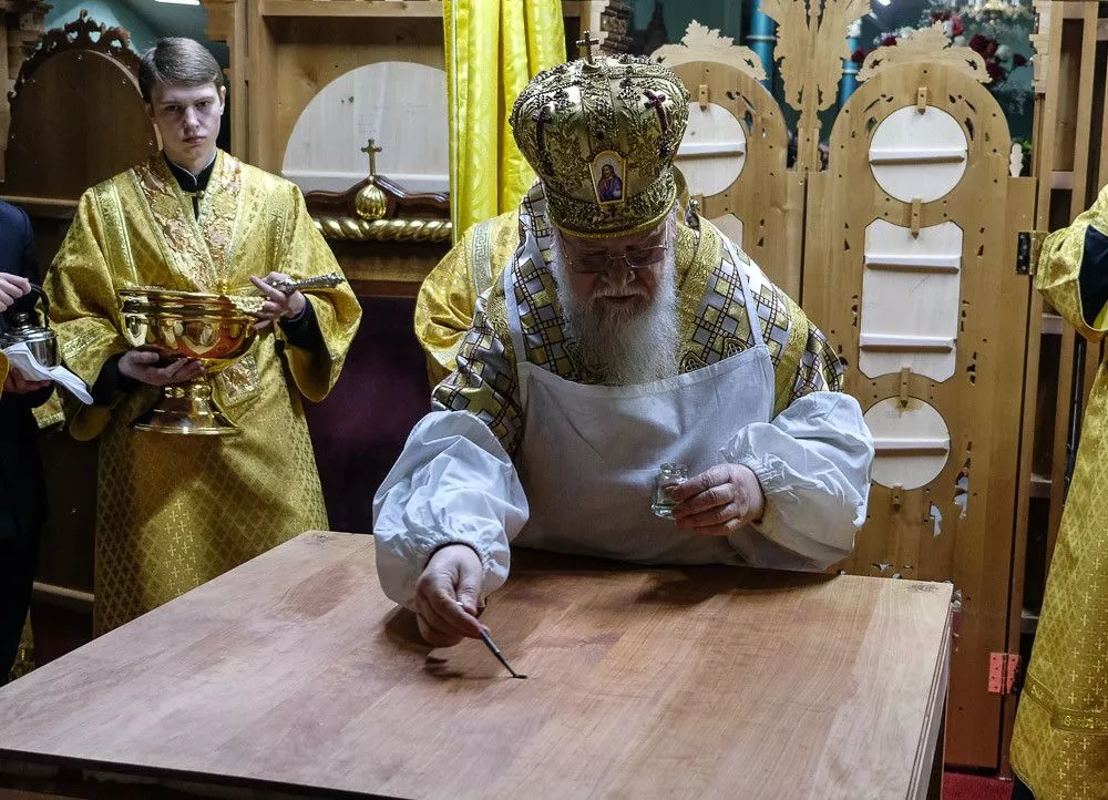 Согласно церковным традициям на столешнице Престола были написаны имена всех священнослужителей, которые молились за этим торжественным событием. После в нее камнями вбили четыре кованых гвоздя, а на сам деревянный престол возлили воду, вино и благовония.