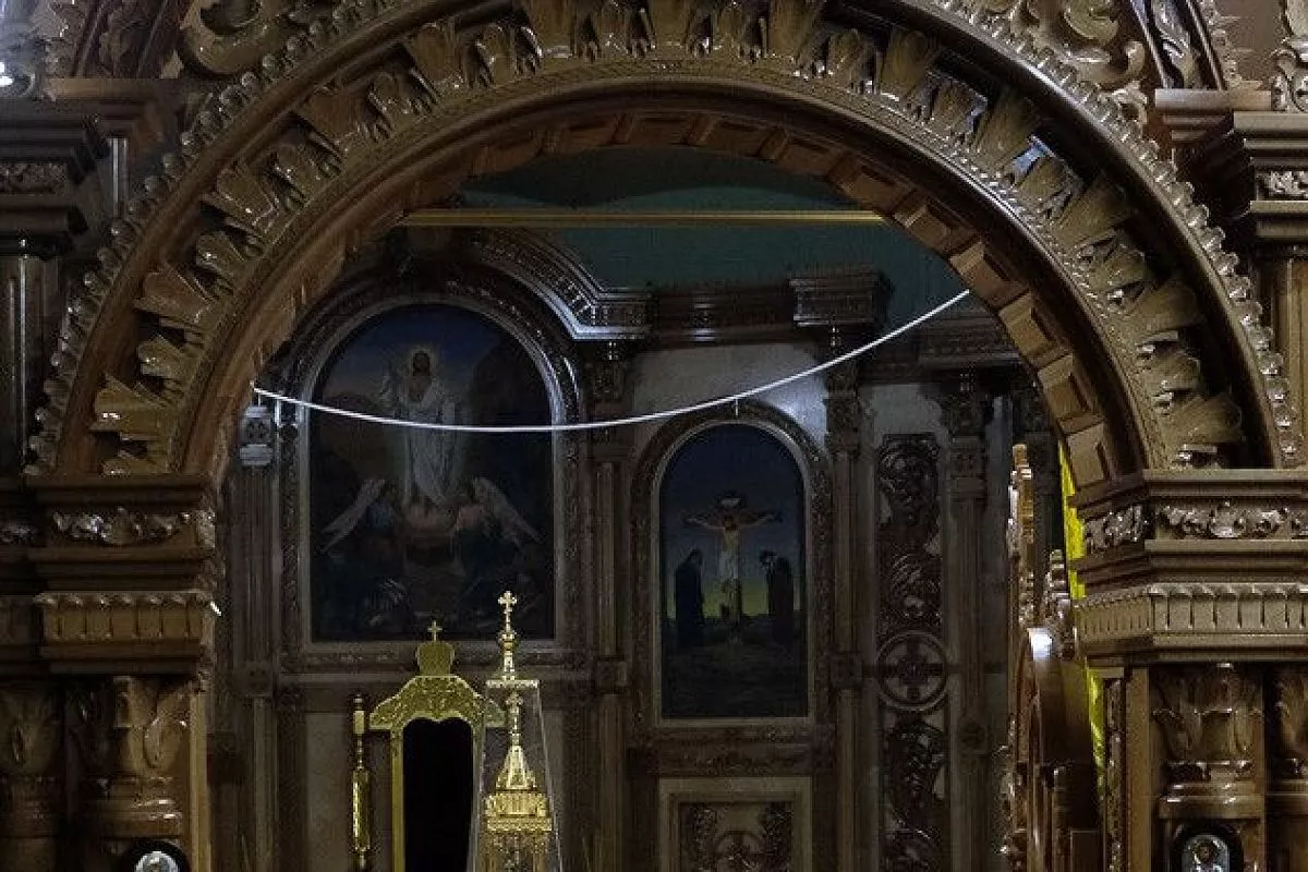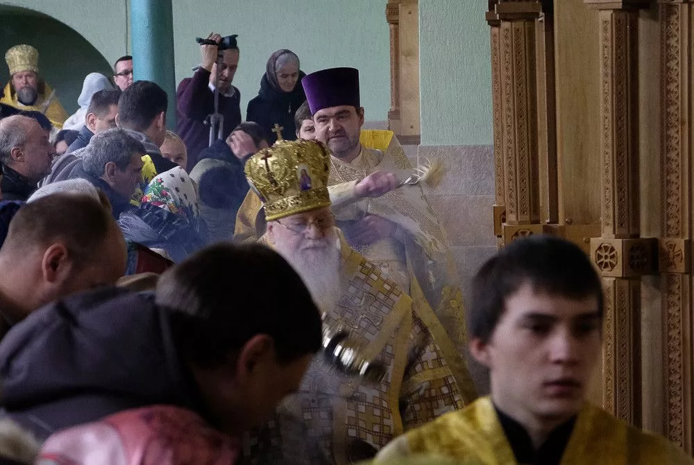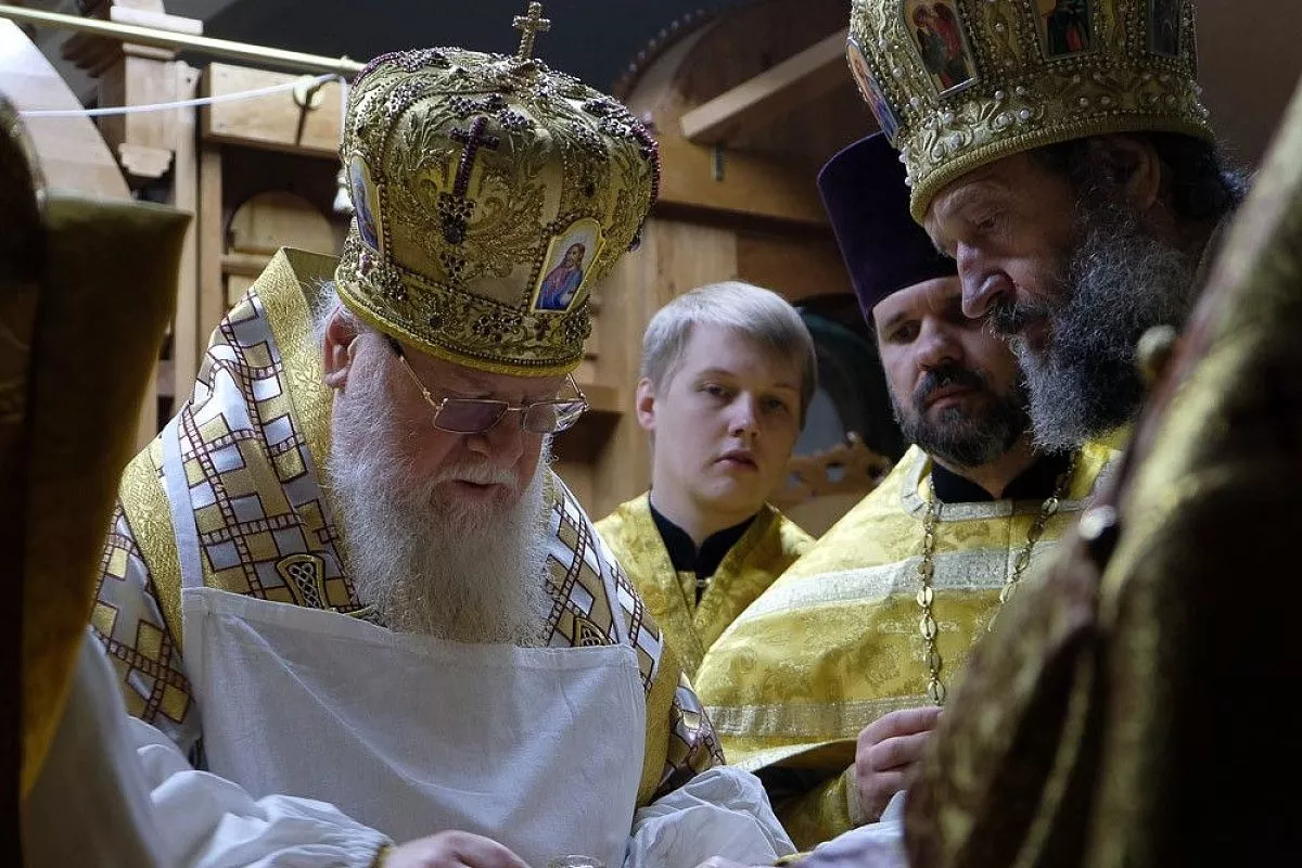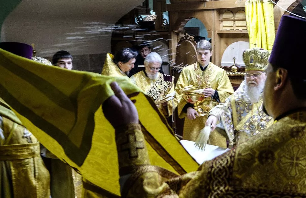 Покрыв все срачицей (нижнее облачение Престола) митрополит Исидор обвязал его крестообразно специальным вервием. В завершении чина стены храма были помазаны миром - особым веществом, которое приготавливает и освящает один раз в год только Патриарх.