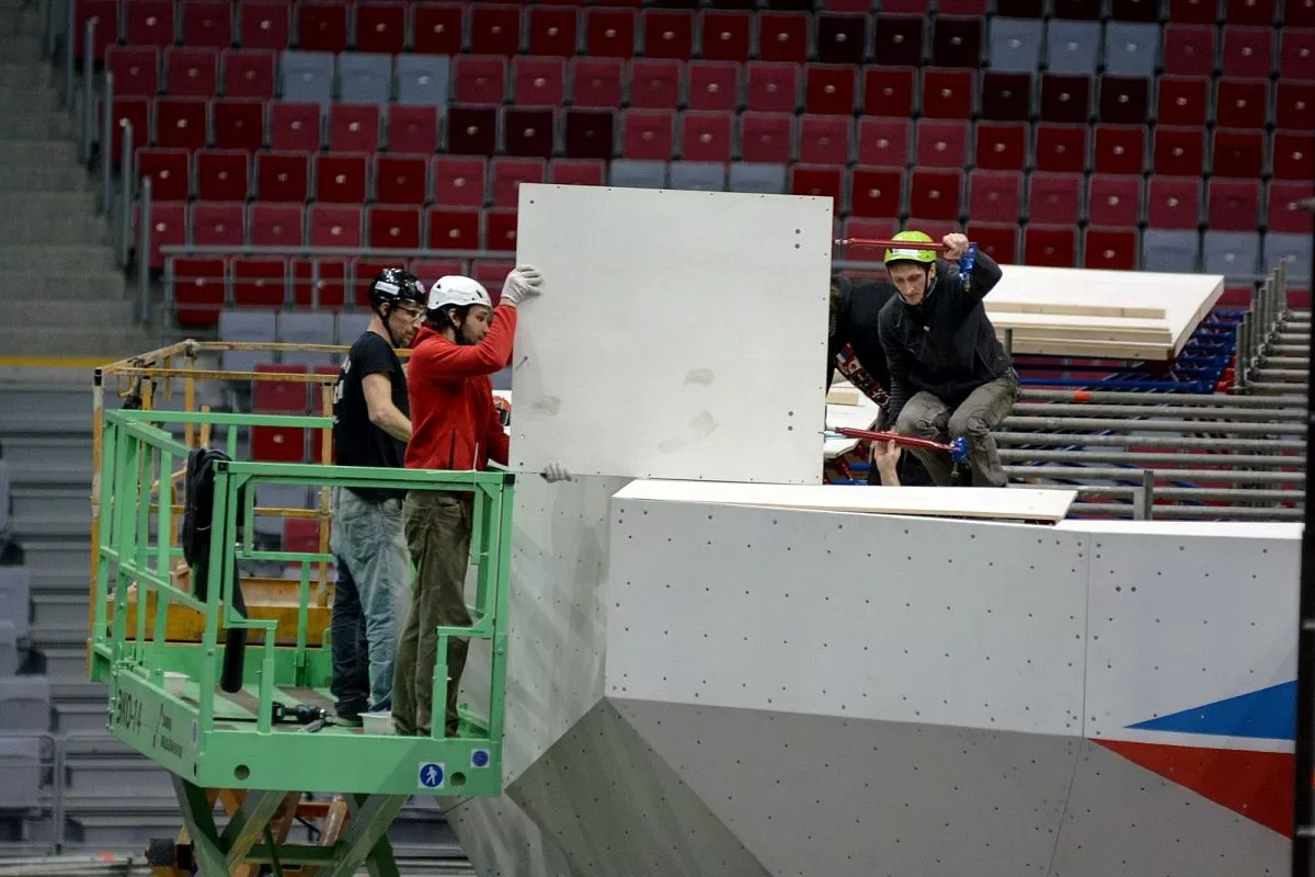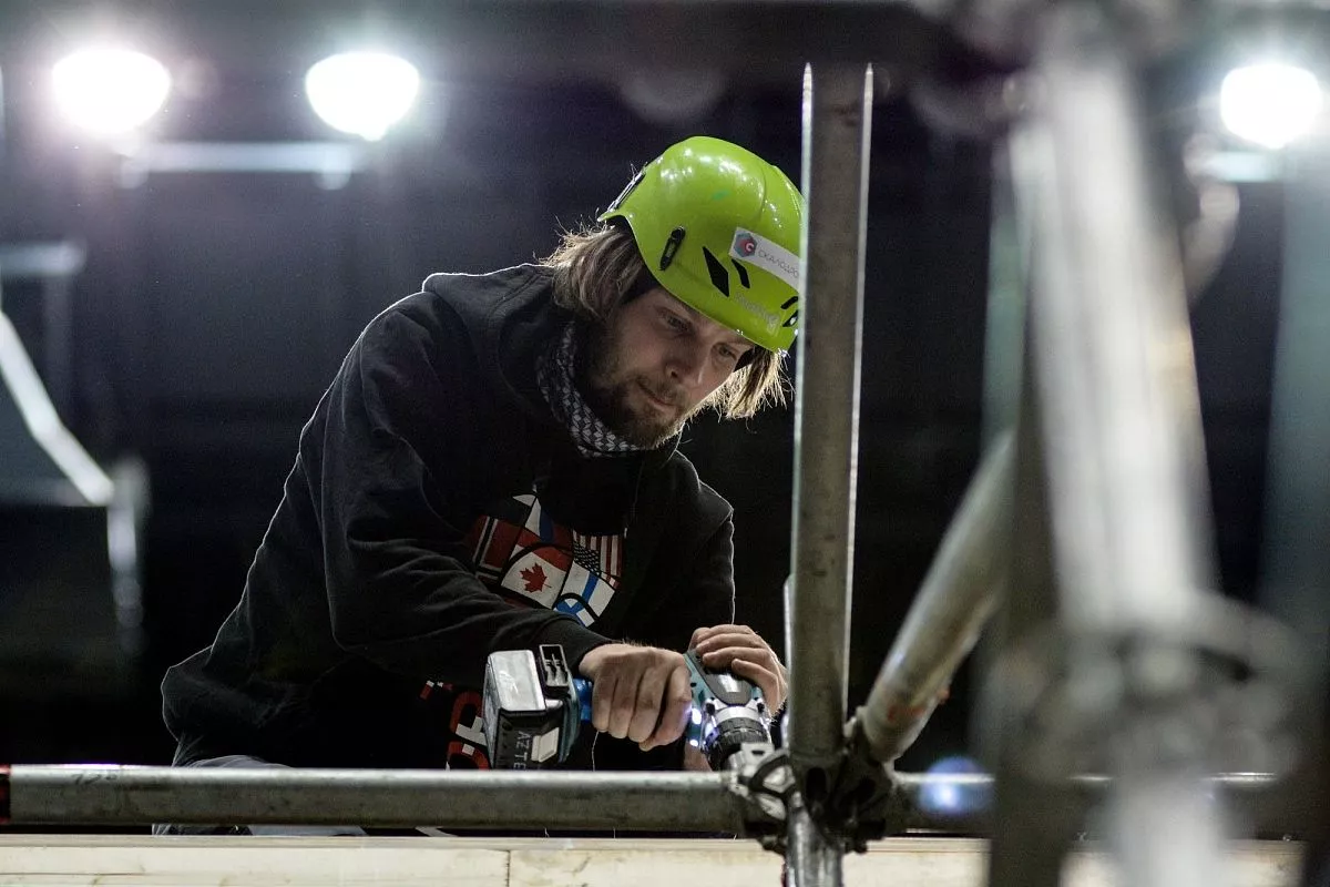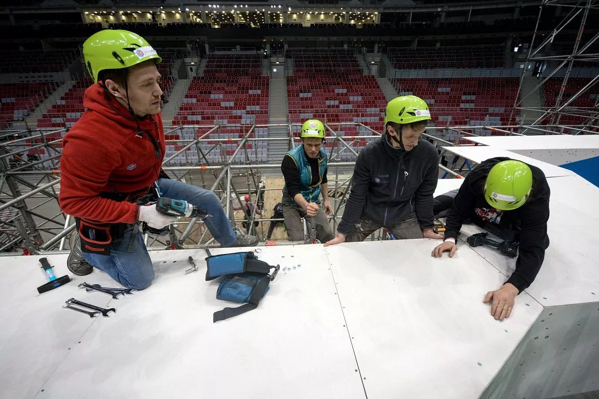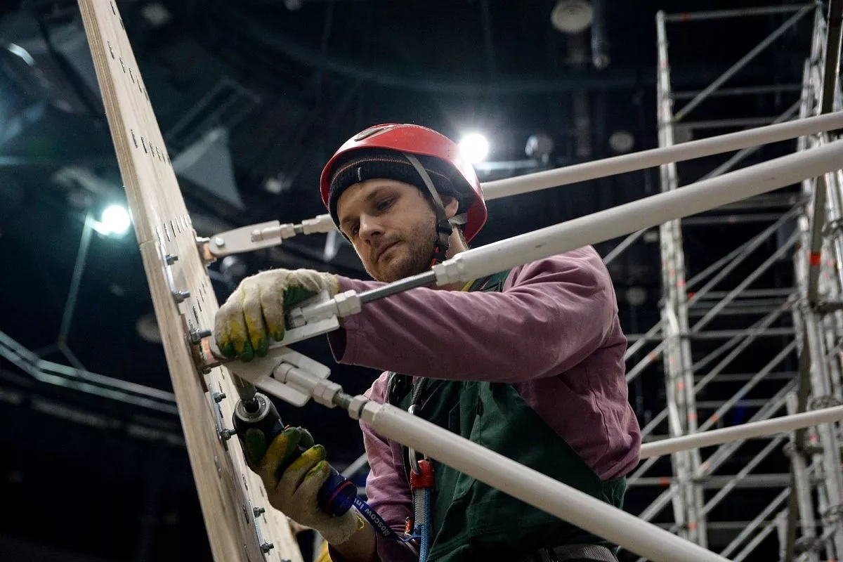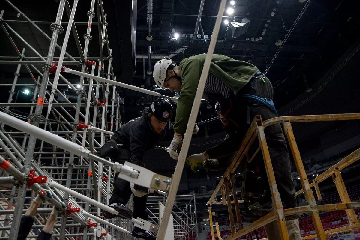Установкой скалодрома в "Большом" занимаются порядка 35 человек - профессиональных промышленных альпинистов. Сборка началась в понедельник, 13 февраля. Полностью конструкция будет собрана к пятнице, 17 февраля.