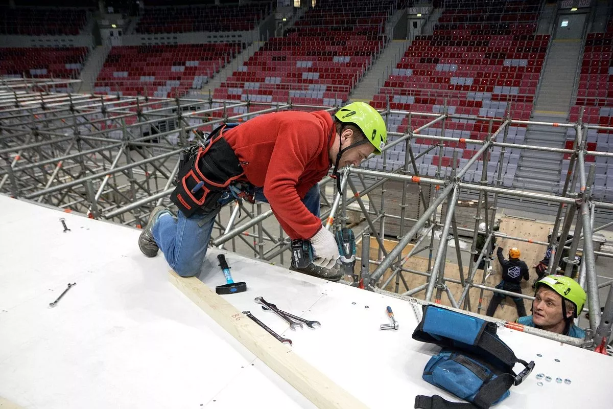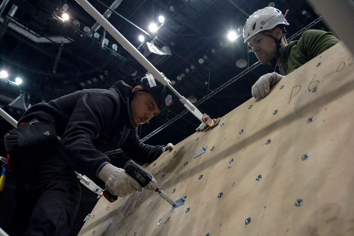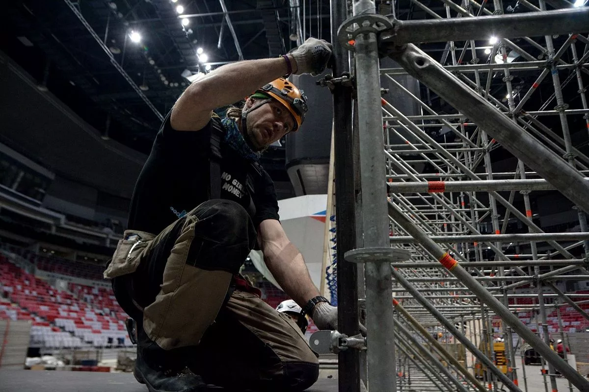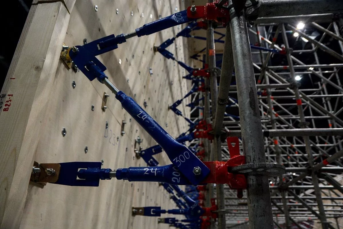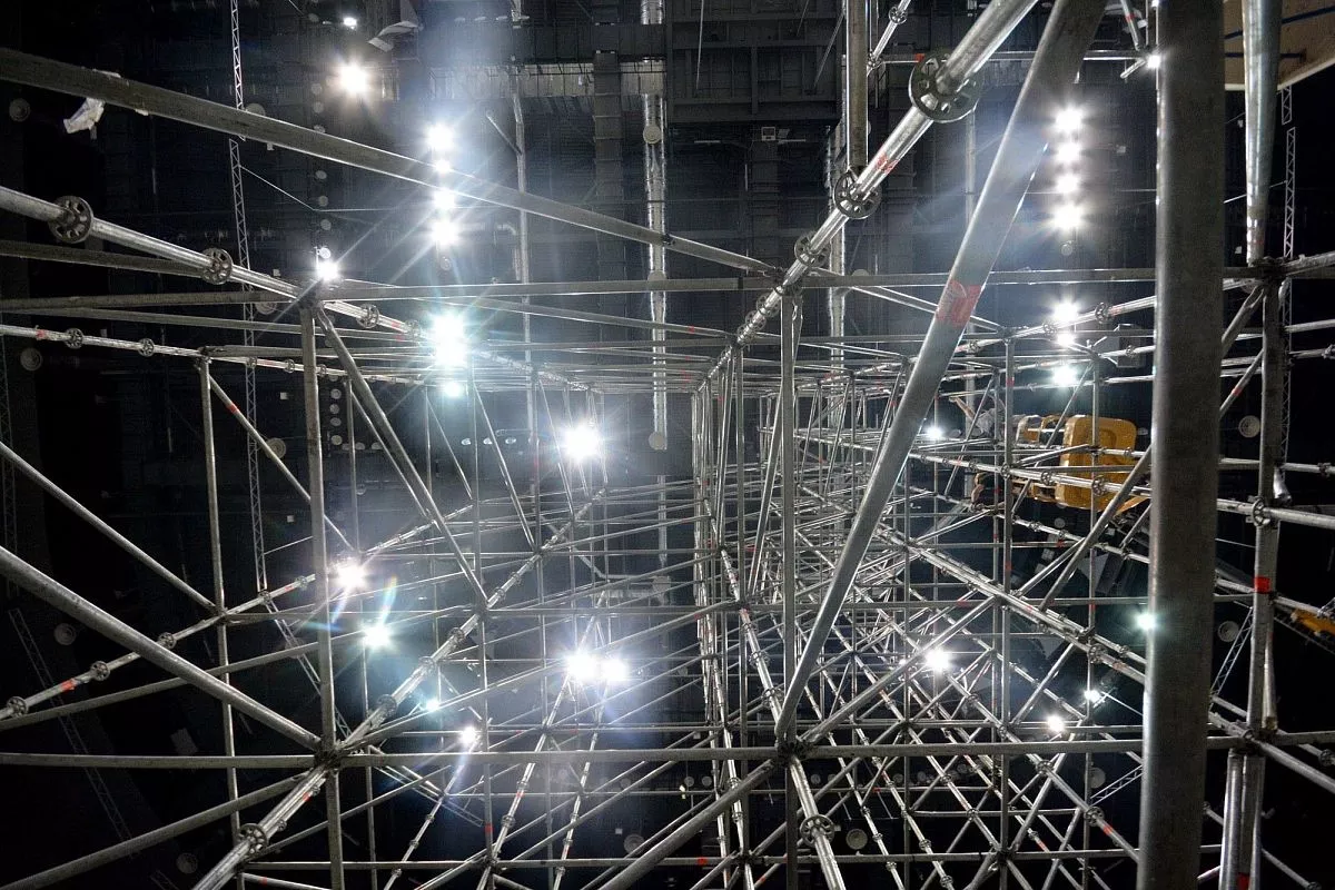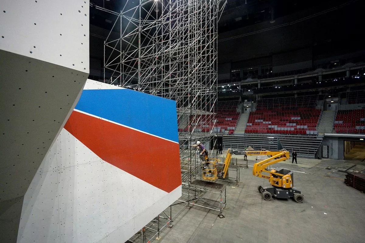 Установкой скалодрома в "Большом" занимаются порядка 35 человек - профессиональных промышленных альпинистов. Сборка началась в понедельник, 13 февраля. Полностью конструкция будет собрана к пятнице, 17 февраля.
