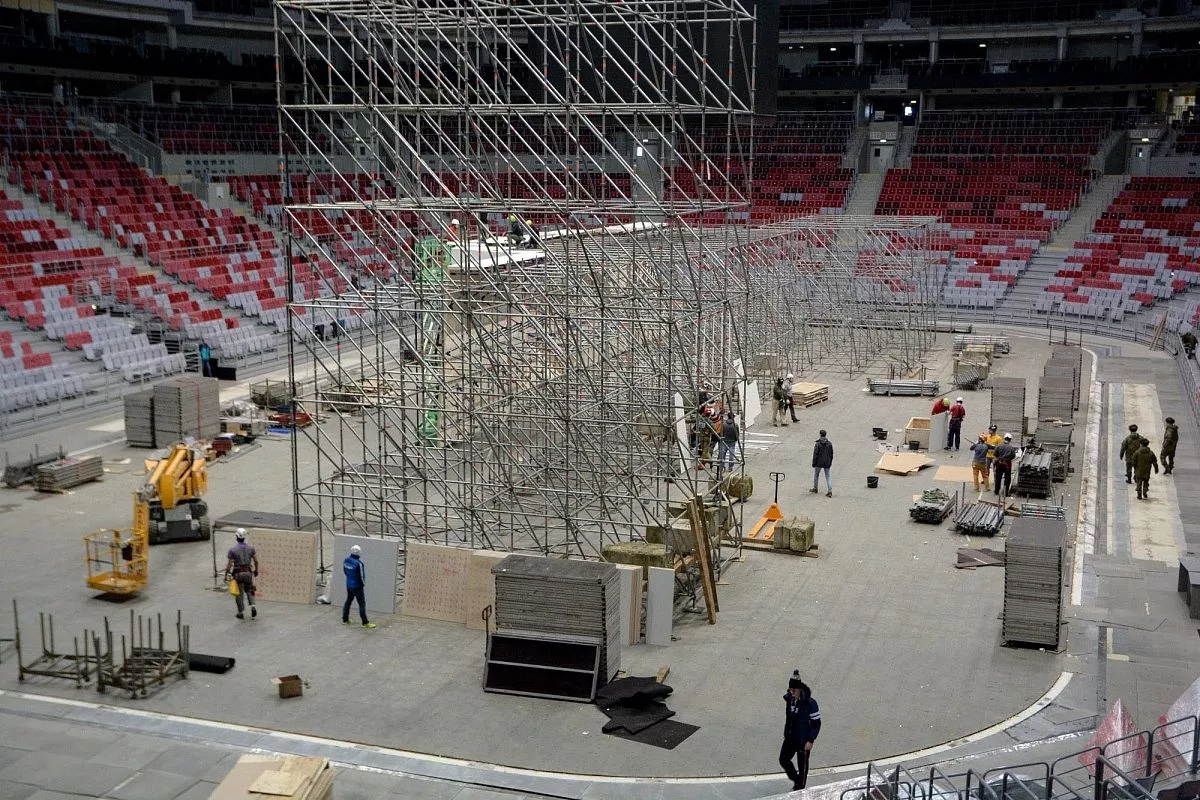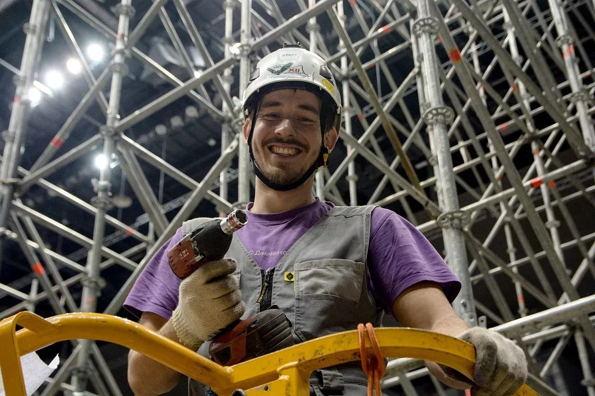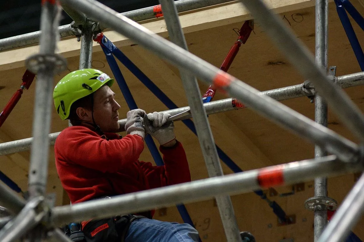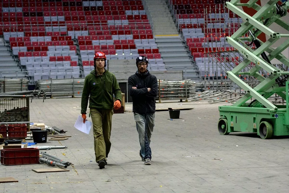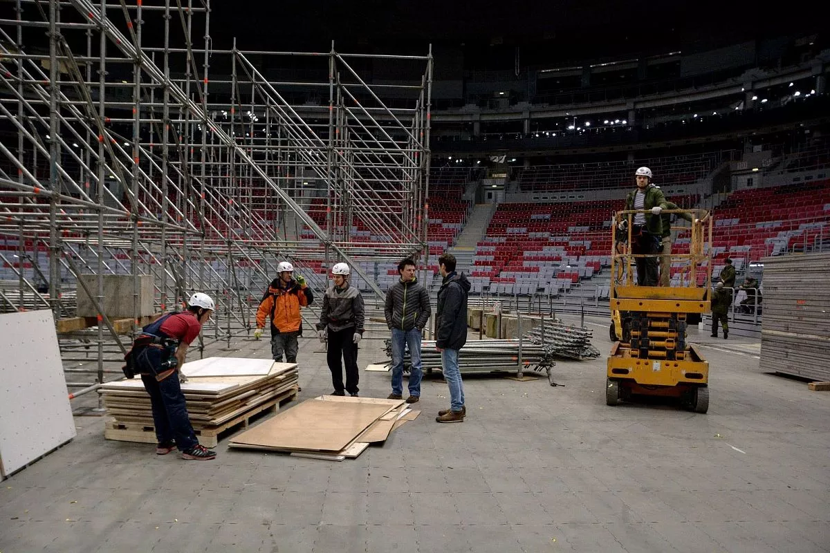 Установкой скалодрома в "Большом" занимаются порядка 35 человек - профессиональных промышленных альпинистов. Сборка началась в понедельник, 13 февраля. Полностью конструкция будет собрана к пятнице, 17 февраля.
