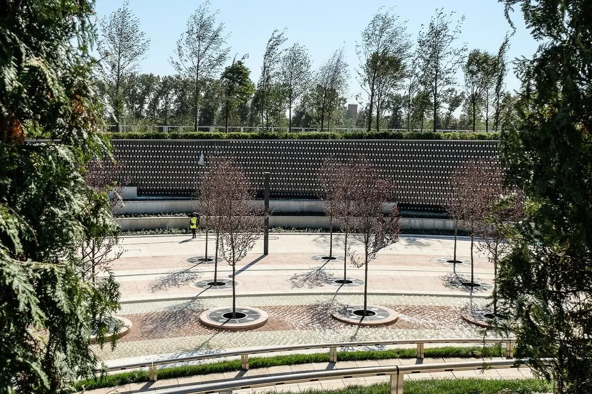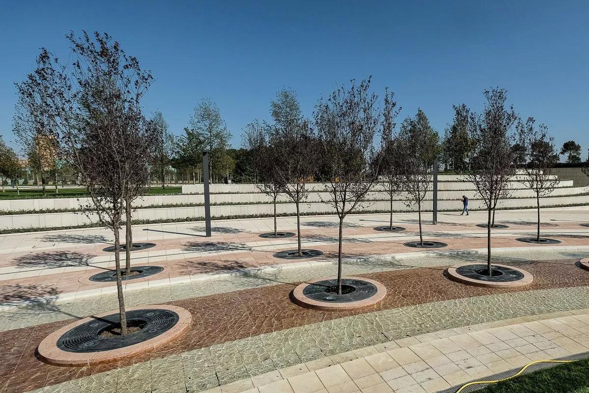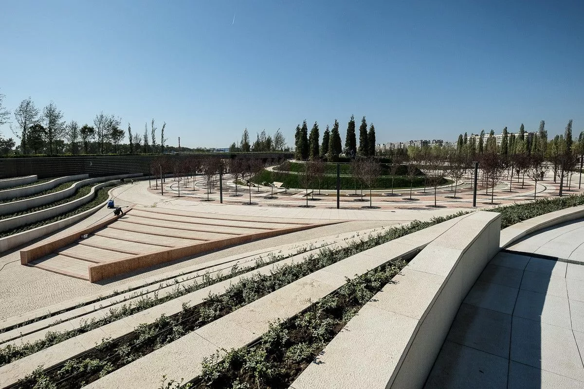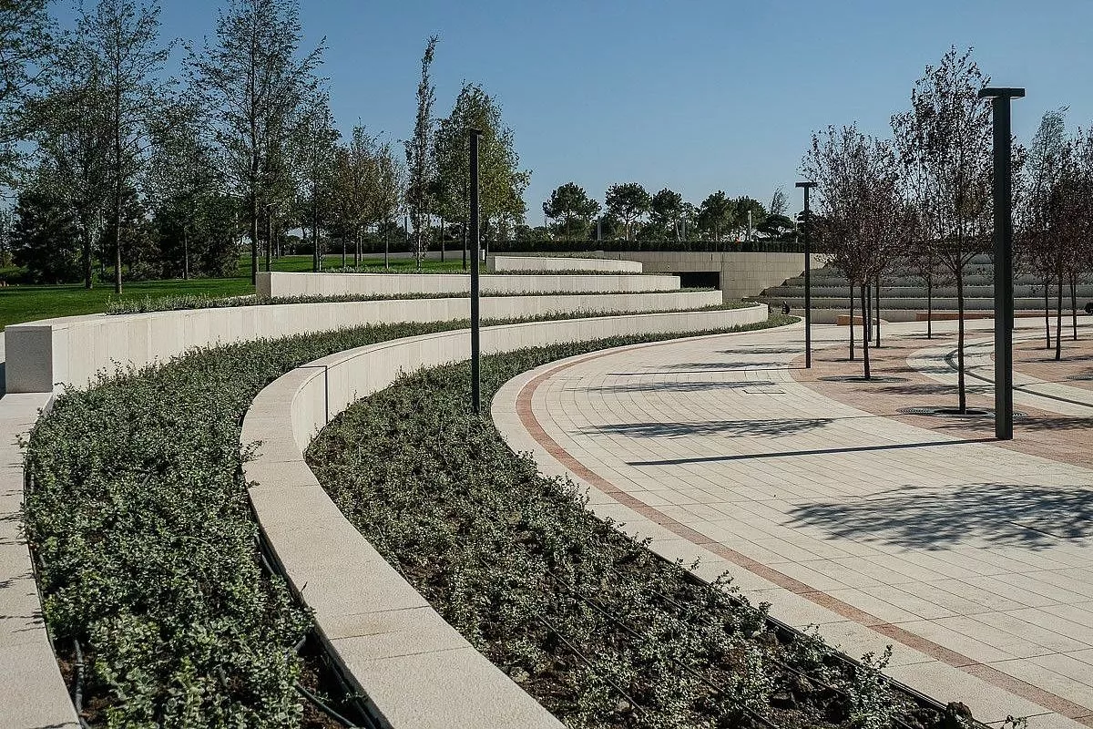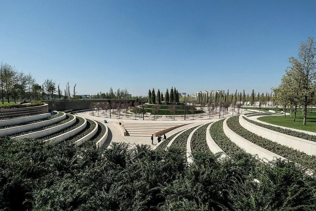 Дизайн паркового комплекса, оригинальные архитектурные и ландшафтные решения разработаны немецким бюро «ГМП Интернейшнл». Мощение и облицовка объектов выполнены из гранита, мрамора, известняка.