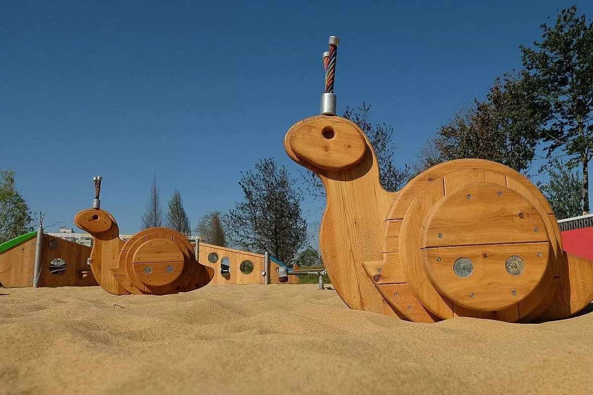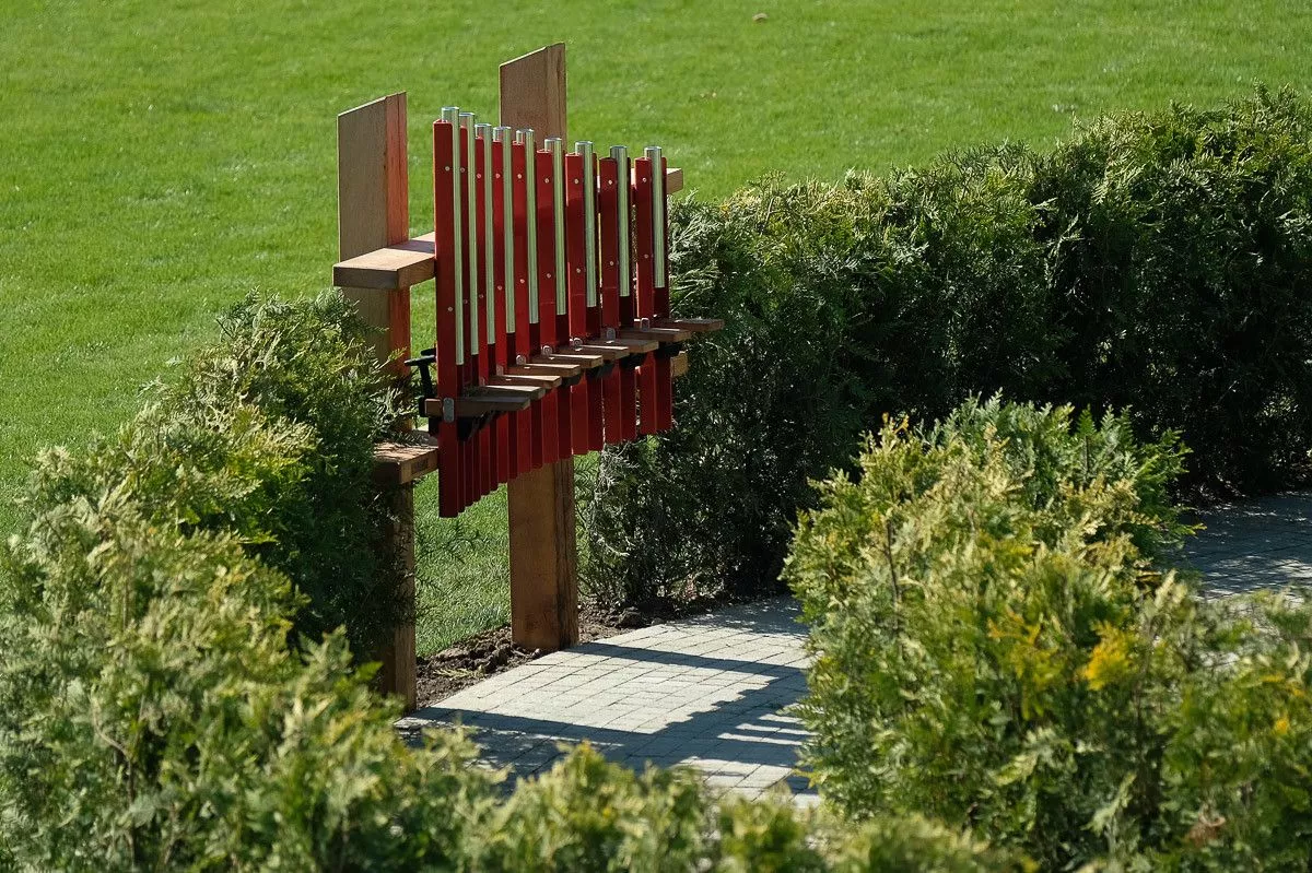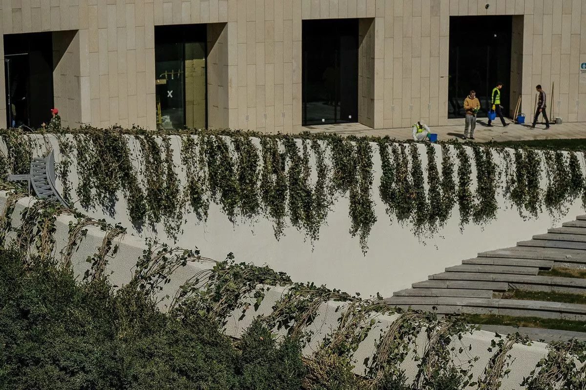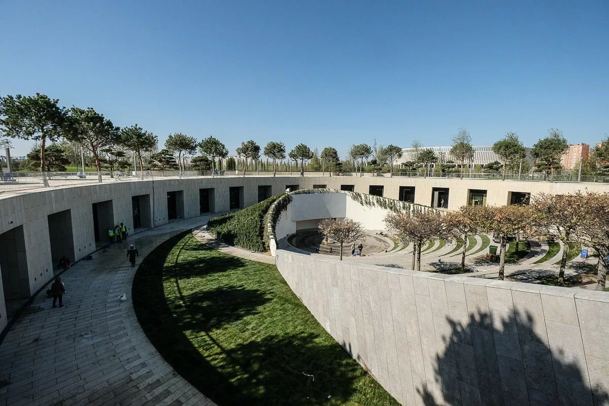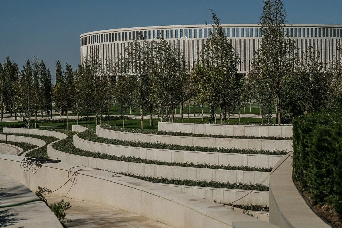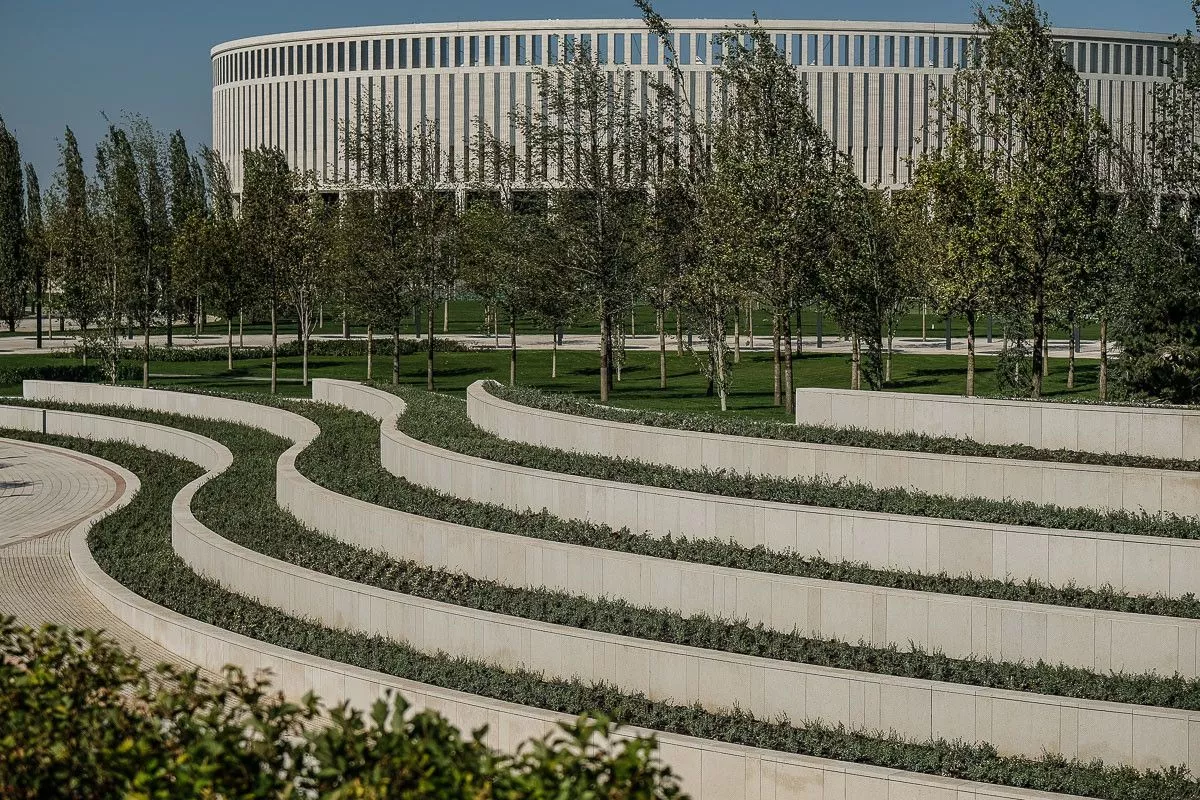 Дизайн паркового комплекса, оригинальные архитектурные и ландшафтные решения разработаны немецким бюро «ГМП Интернейшнл». Мощение и облицовка объектов выполнены из гранита, мрамора, известняка.