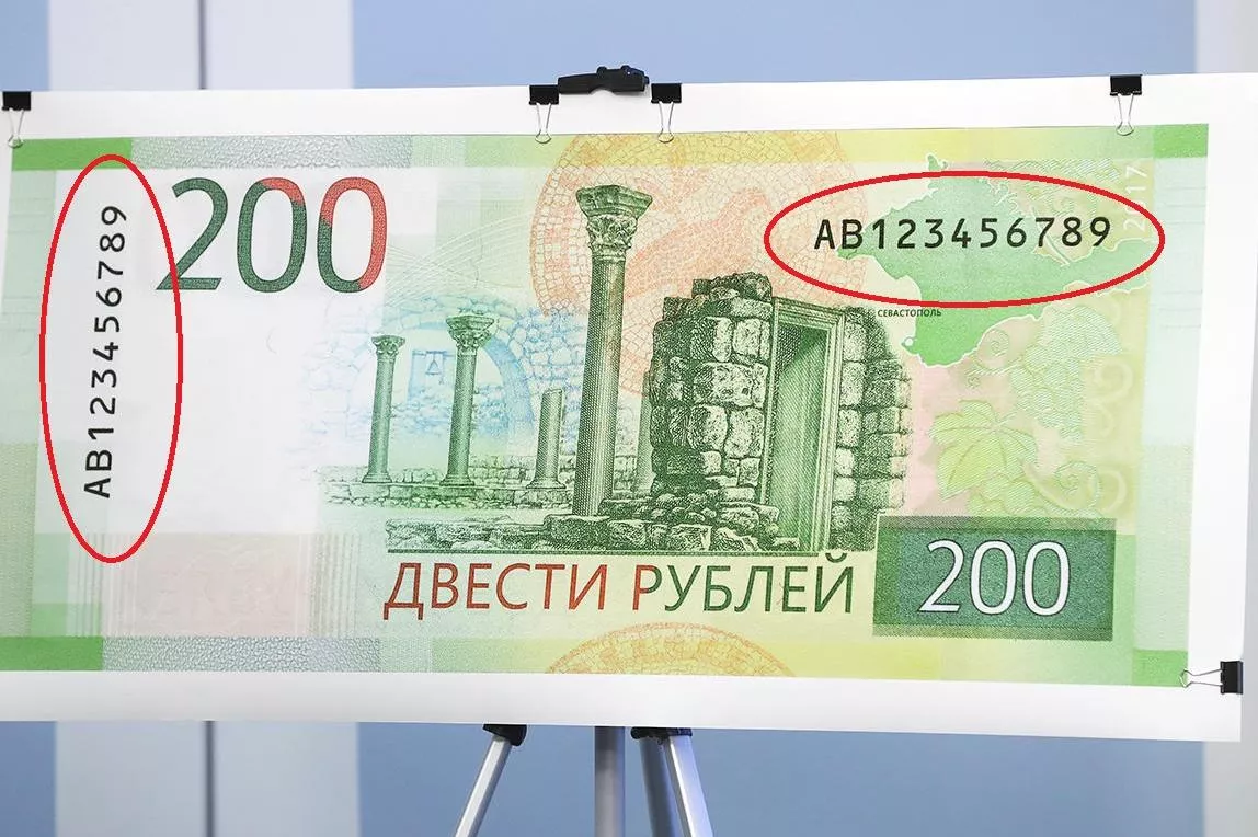 У банкнот есть серийные номера, расположенные на оборотной стороне, это – двухбуквенное обозначение серии и девять цифр номера. Левый номер имеет читаемость по короткой стороне банкноты, правый – по длинной стороне.