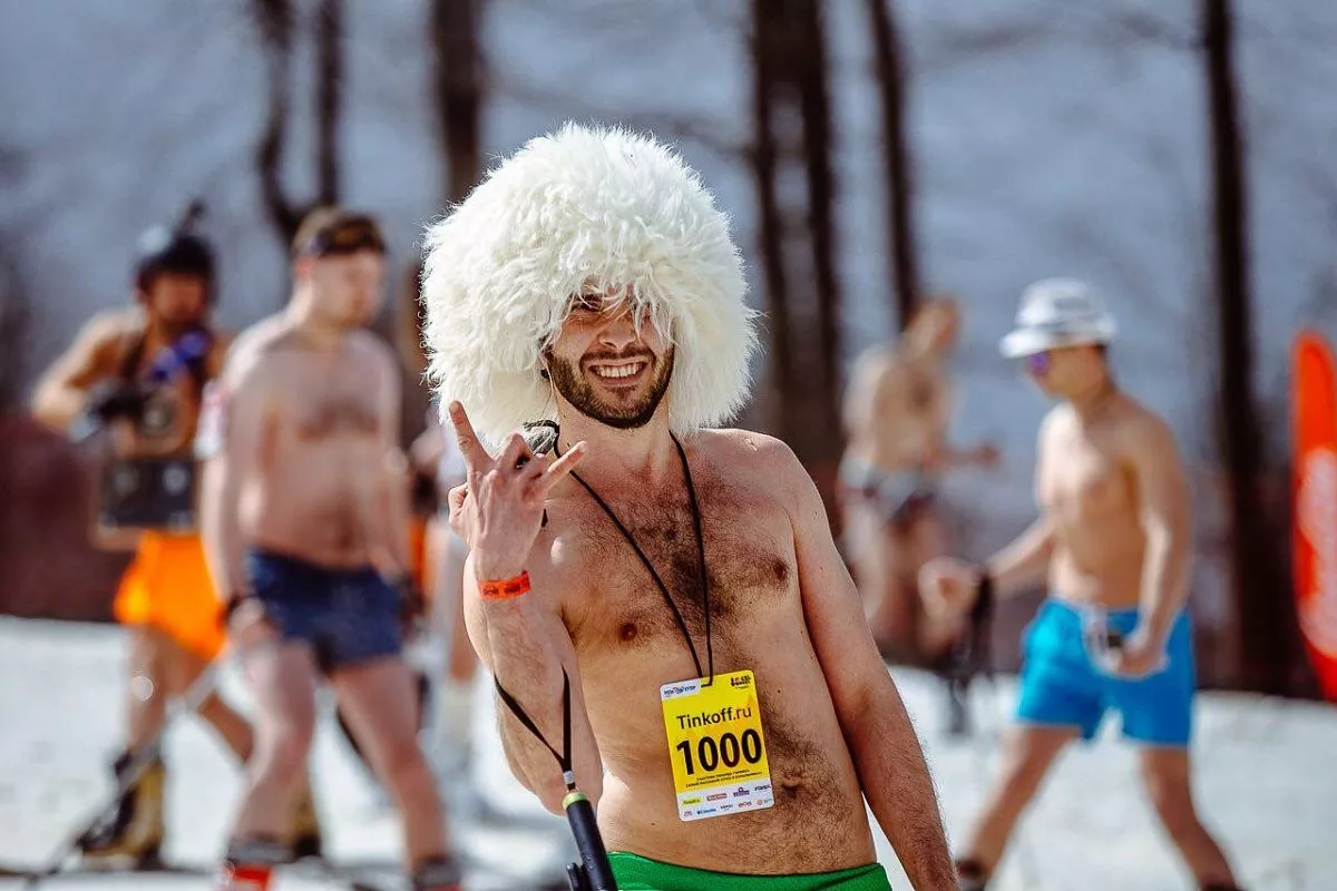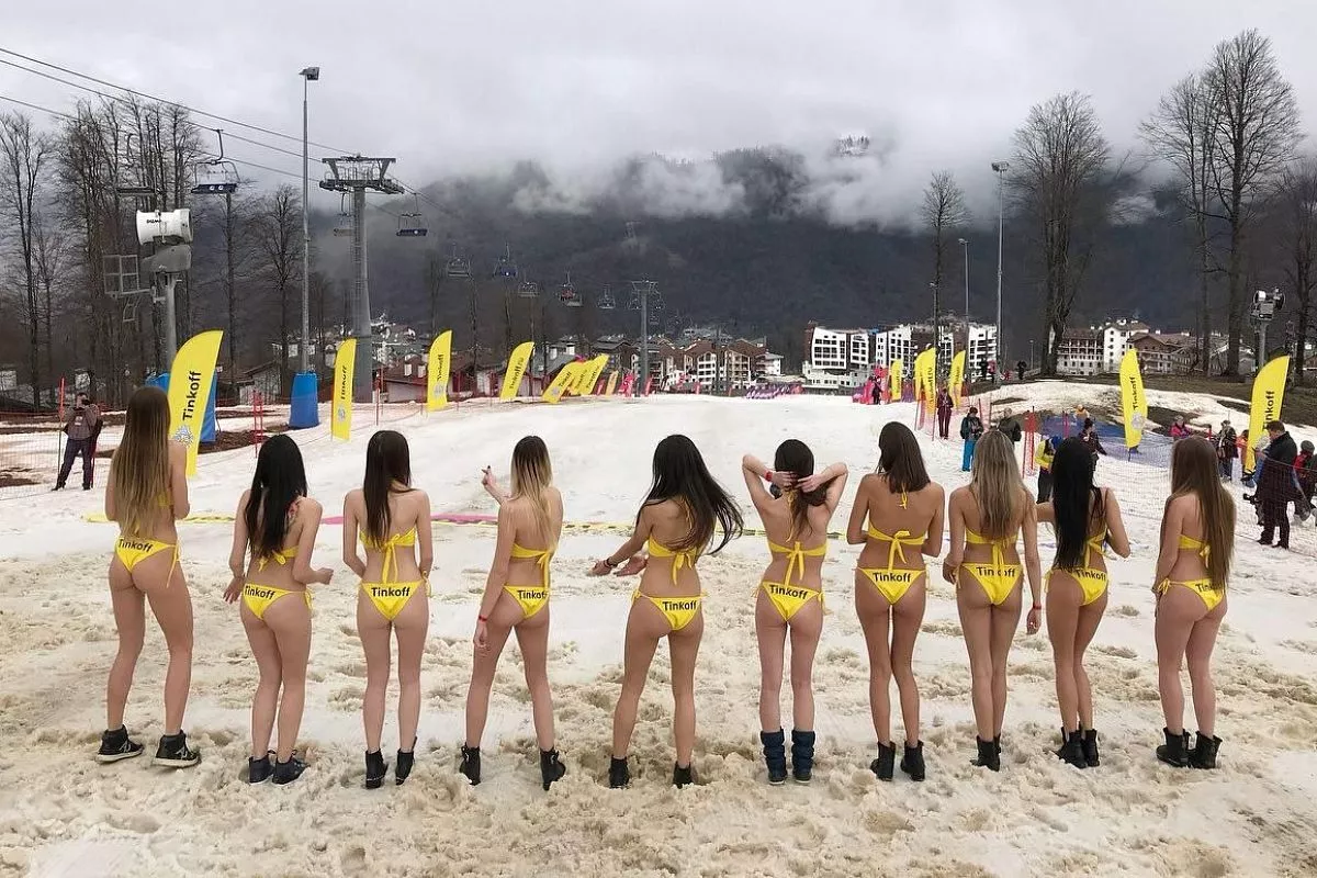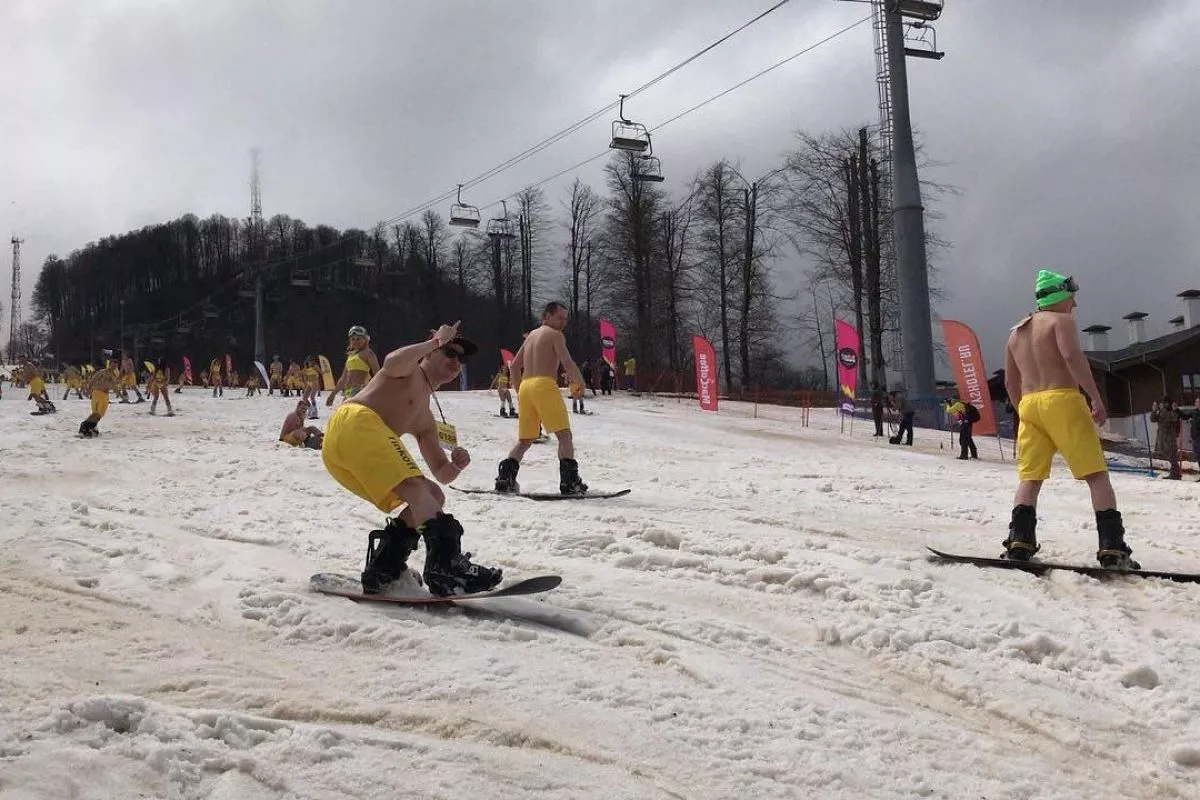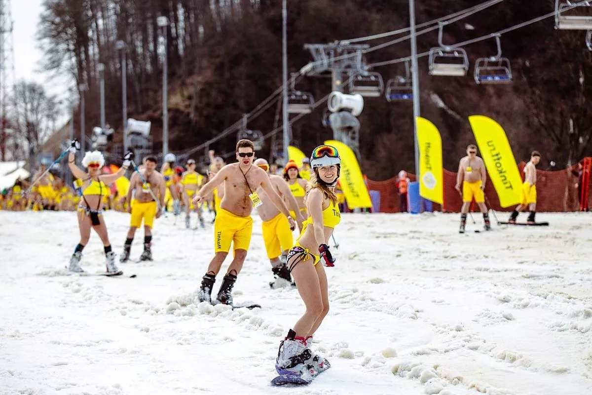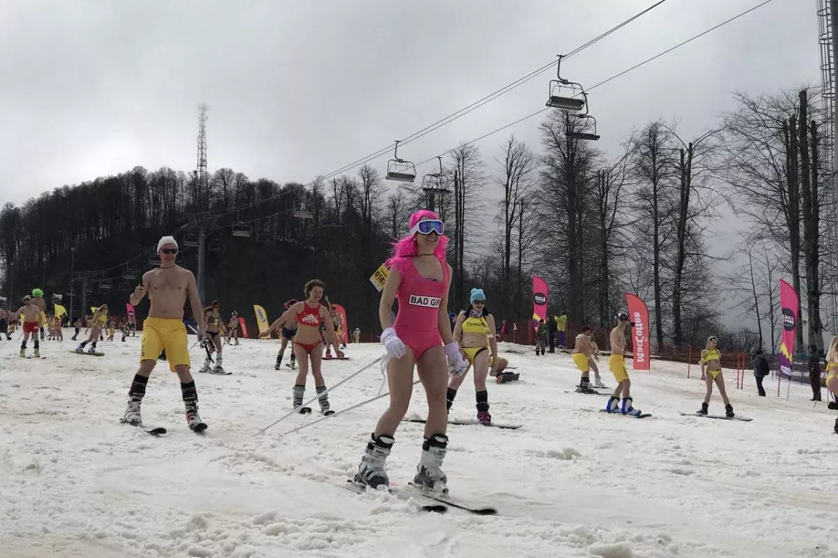 В Сочи на горнолыжном курорте «Роза Хутор» около 1,8 тыс. лыжников и сноубордистов спустились с горы в ярких купальных костюмах.