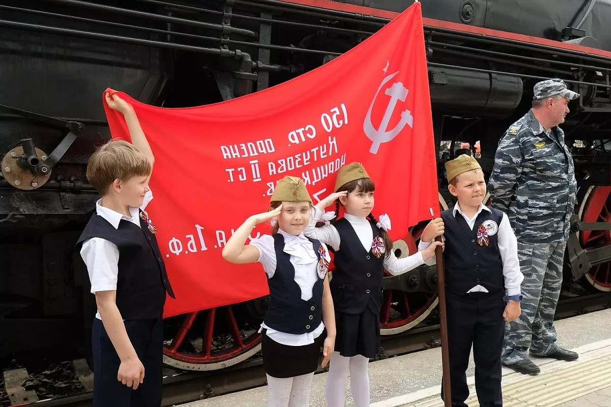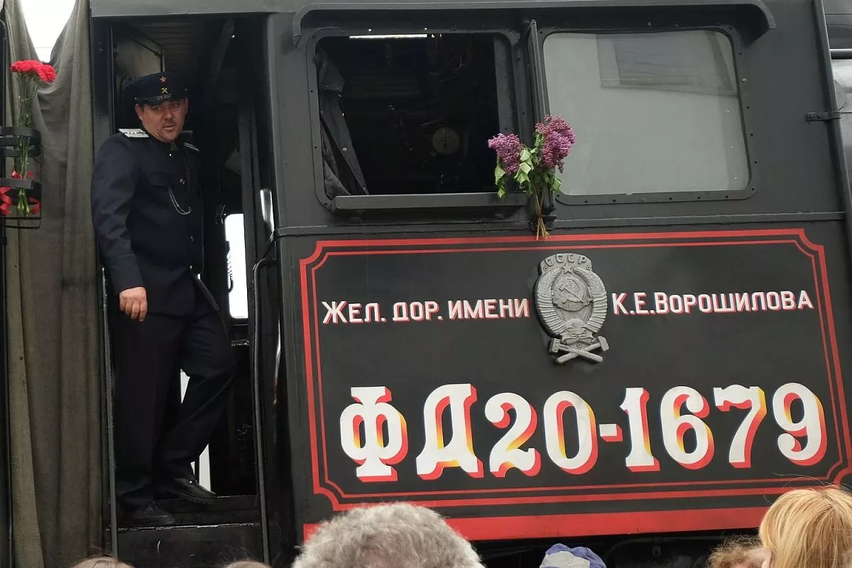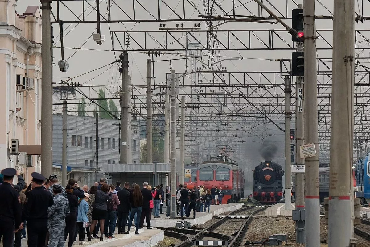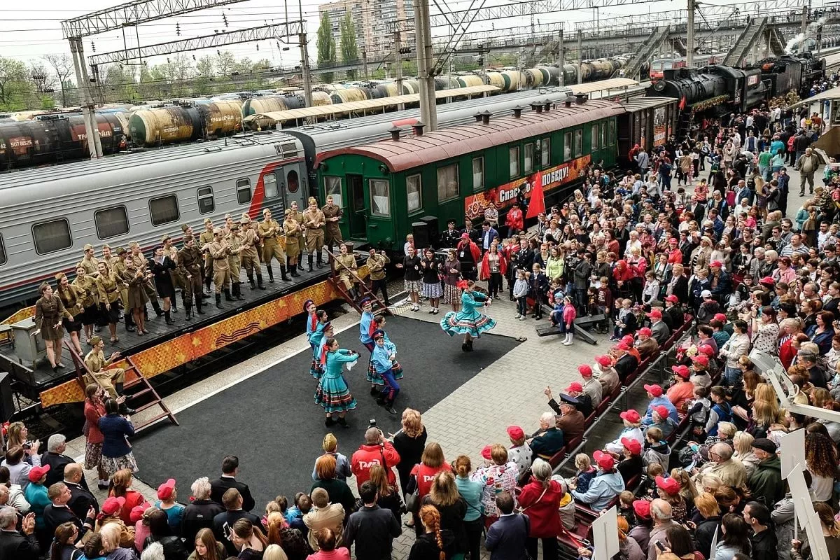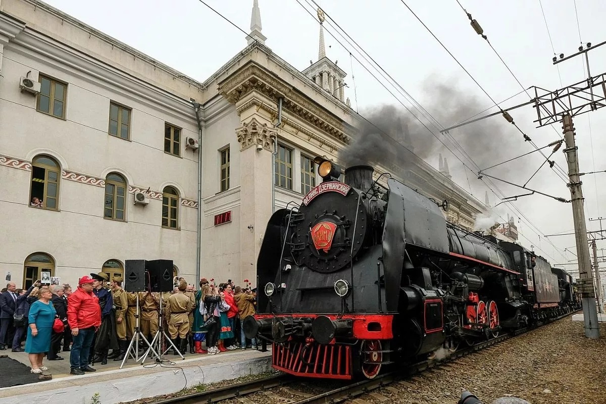 Ретро-поезд «Победа» сформирован из вагонов времен Великой Отечественной войны. Его ведут два паровоза, один из которых принимал участие в Сталинградской битве. В составе крытые товарные вагоны, платформы для перевозок военной техники, салон-вагон. Вся техника – из экспозиции музея железнодорожной техники СКЖД.