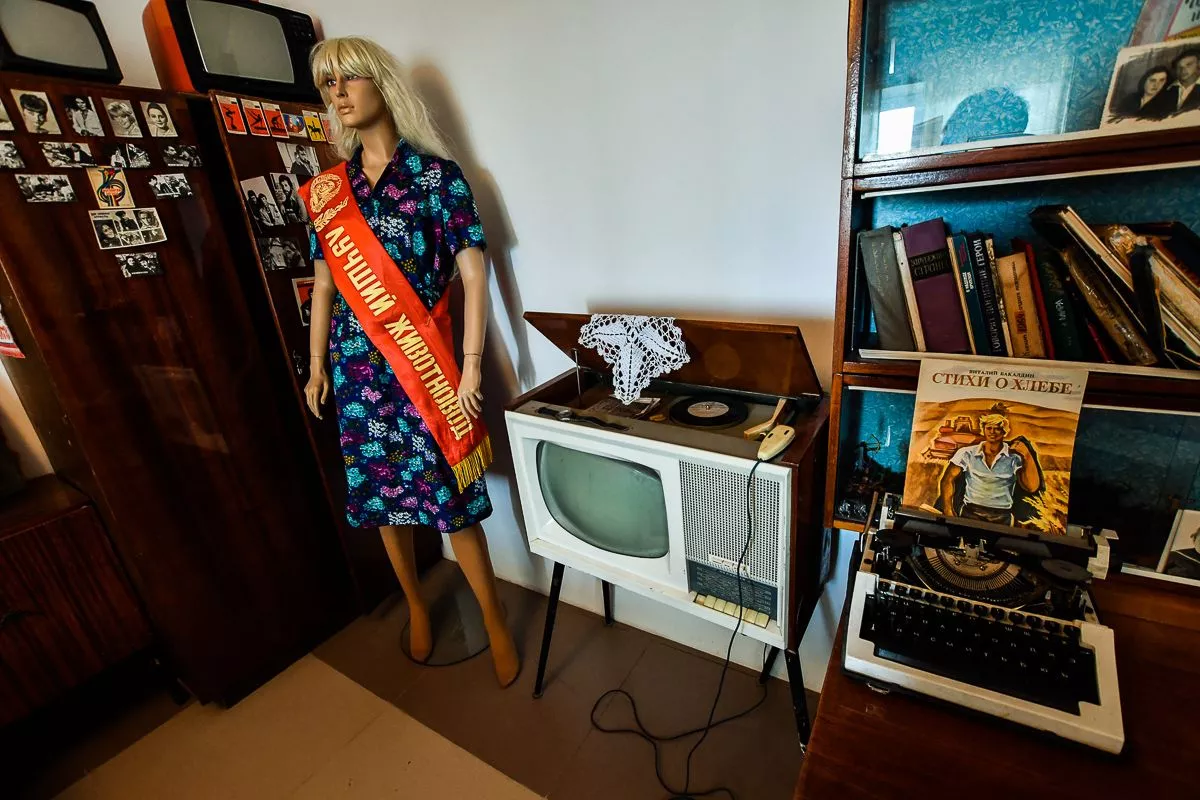 – Здесь есть очень любопытные экспонаты. Например, этот женский костюм, – показывает на манекен Владислав, – платье с цветочным принтом, а под ним – мечта всех советских модниц – чулки с резинками-застежками и розовые панталончики. Или это чудо техники – телерадиола. Мало кто знает, что еще в советские годы наша отечественная индустрия выпускала телевизоры с проигрывателем и пультом управления!
