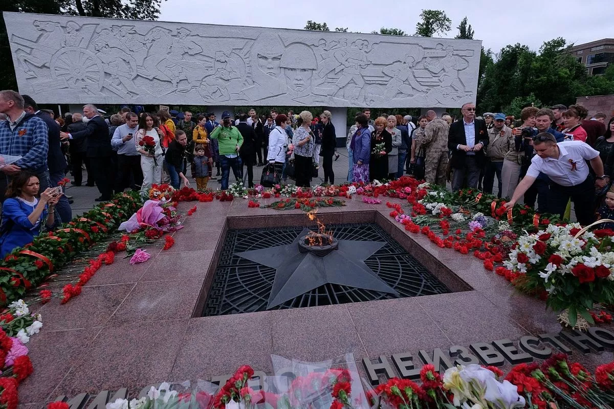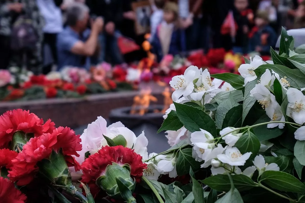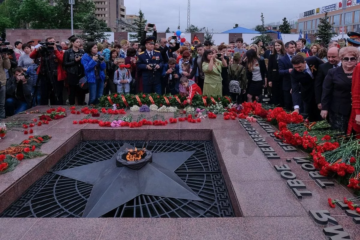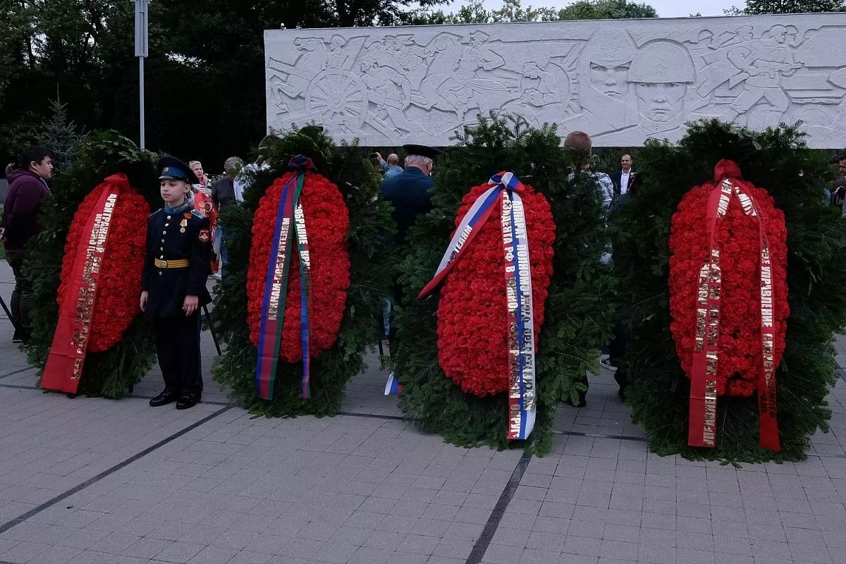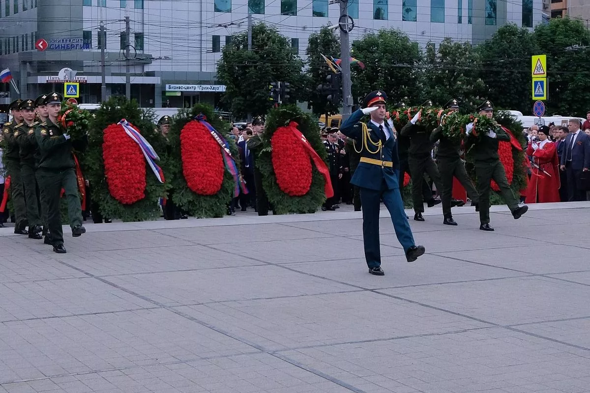 В 10.00 прошла торжественная церемония возложения венков и цветов погибшим защитникам Отечества на площади Памяти Героев у Вечного огня.