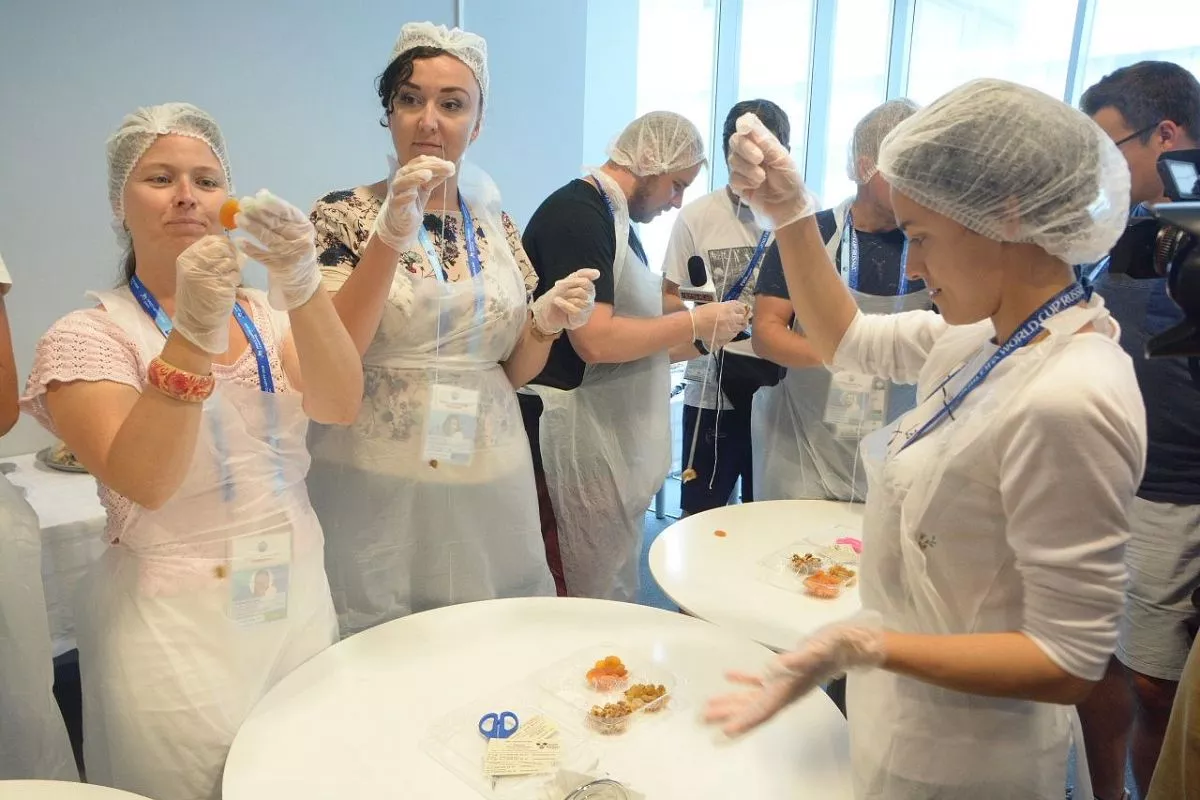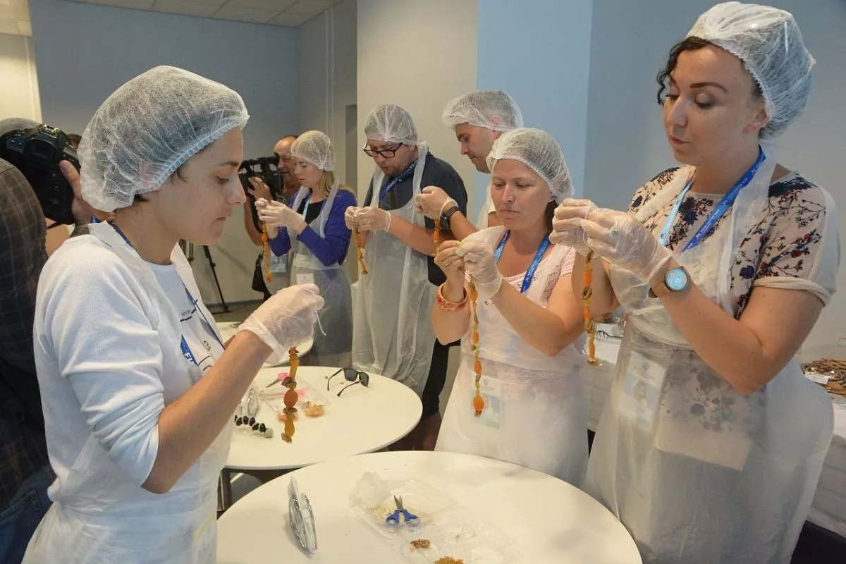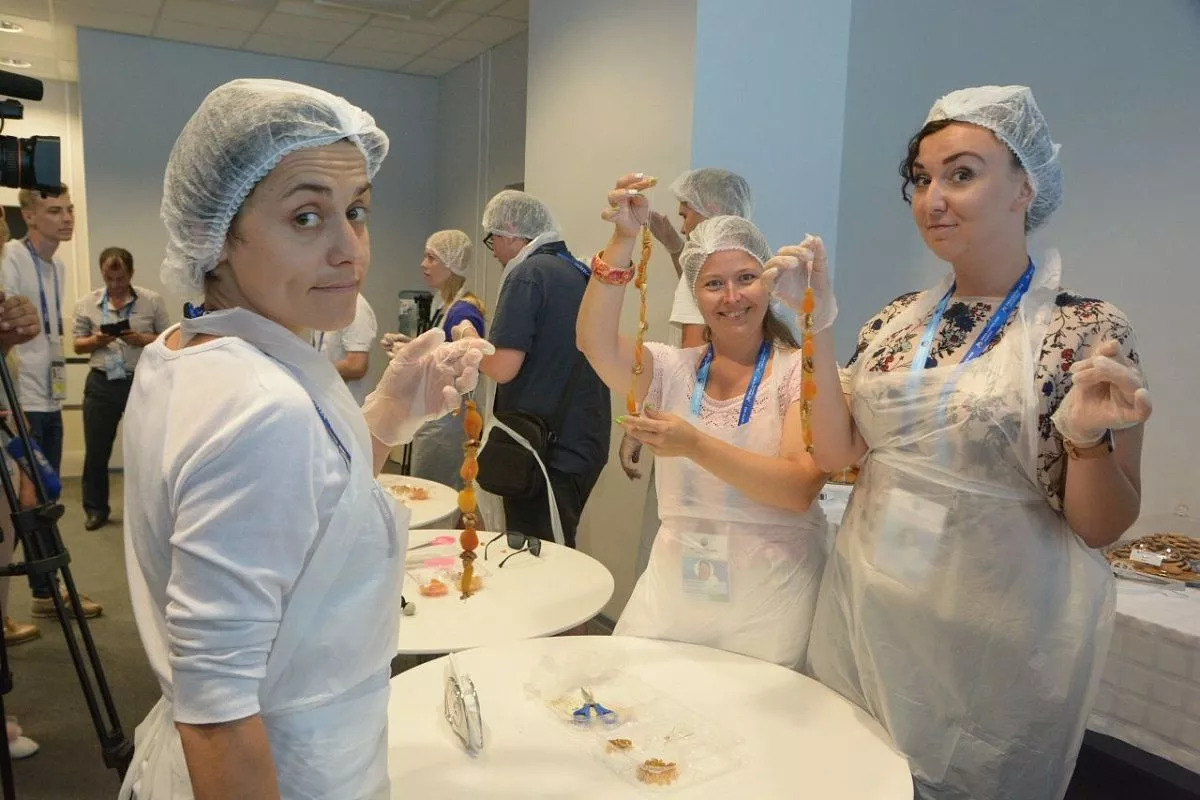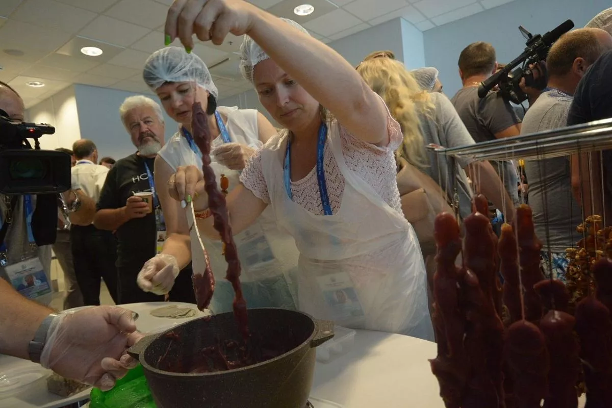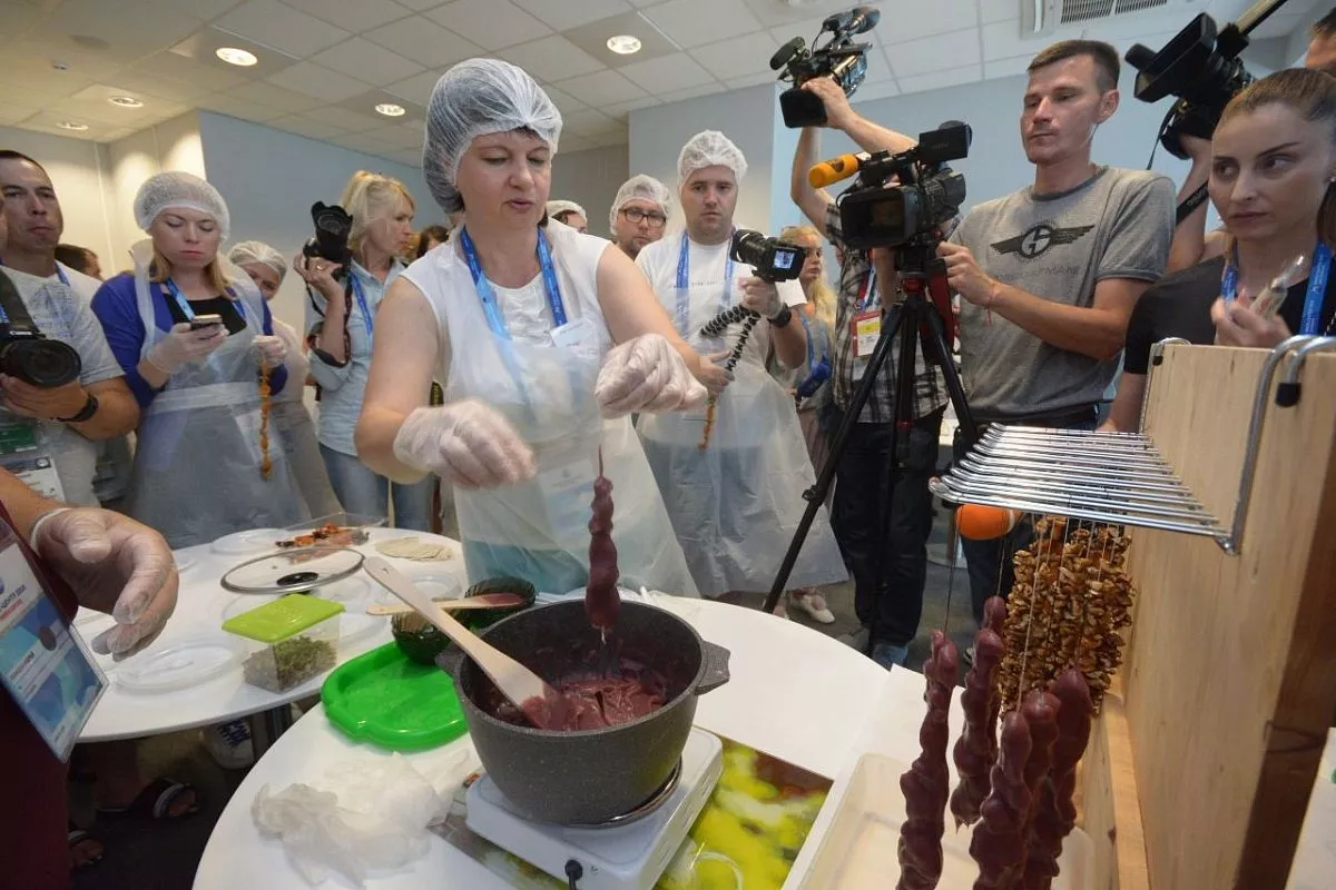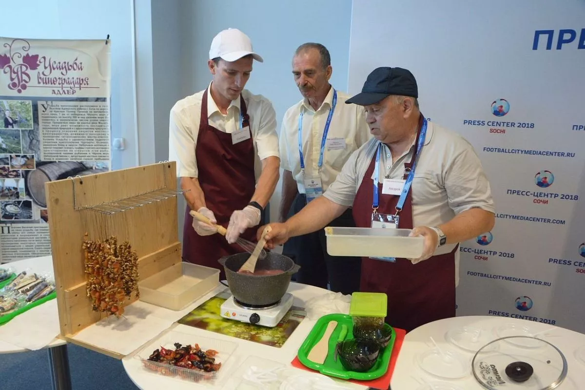 Мастер-класс по изготовлению чурчхелы вызвал большой интерес среди представителей прессы в Сочи. К назначенному времени в городской пресс-центр ЧМ-2018 стянулись многочисленные журналисты. Облачившись в фартуки, шапочки и перчатки бригада СМИ приступила к приготовлению чурчхелы.