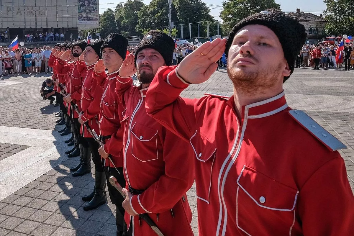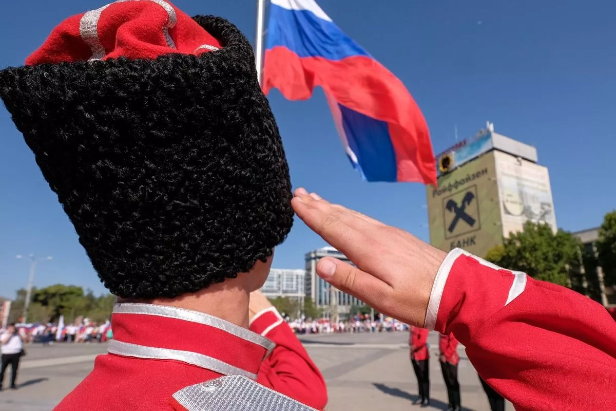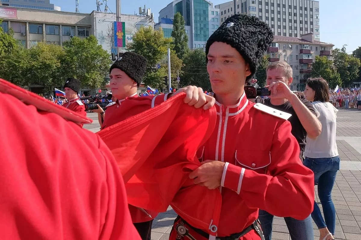 Затем полотно размером 10 на 15 метров доставили к флагштоку представители Почетного караула Кубанского казачьего войска и под звуки государственного гимна Флаг России был поднят.