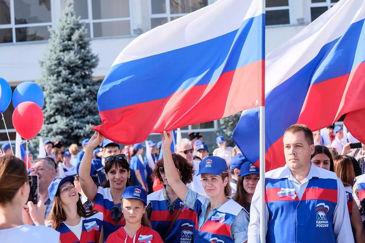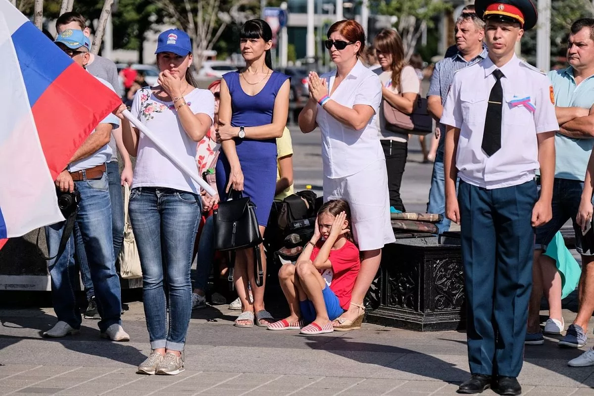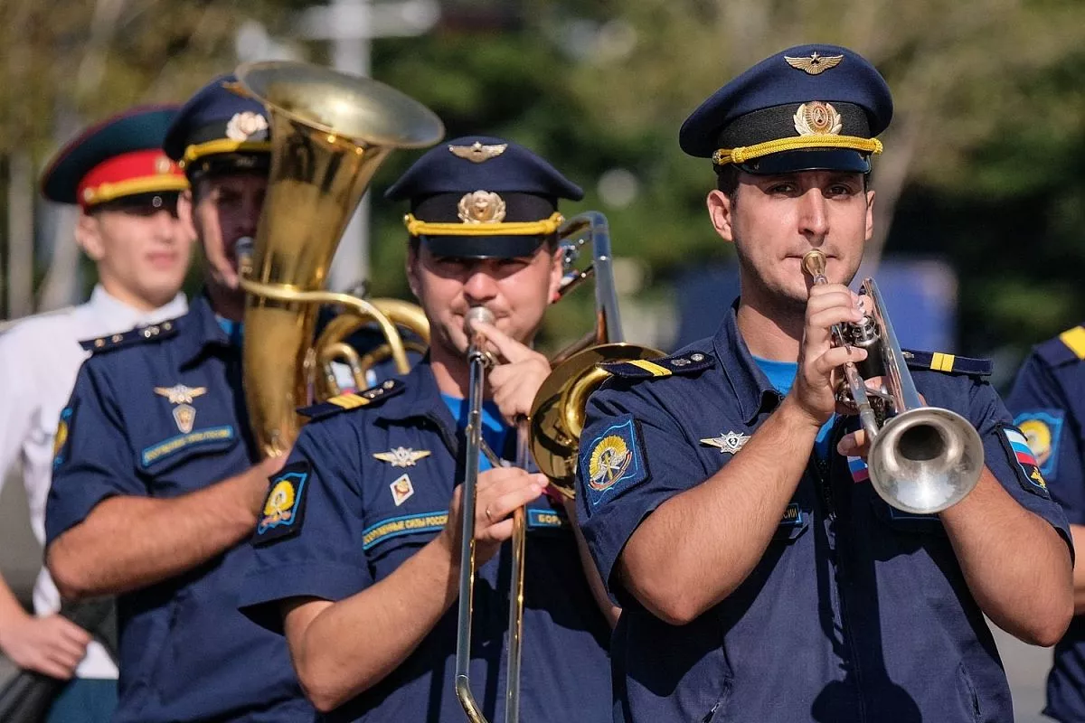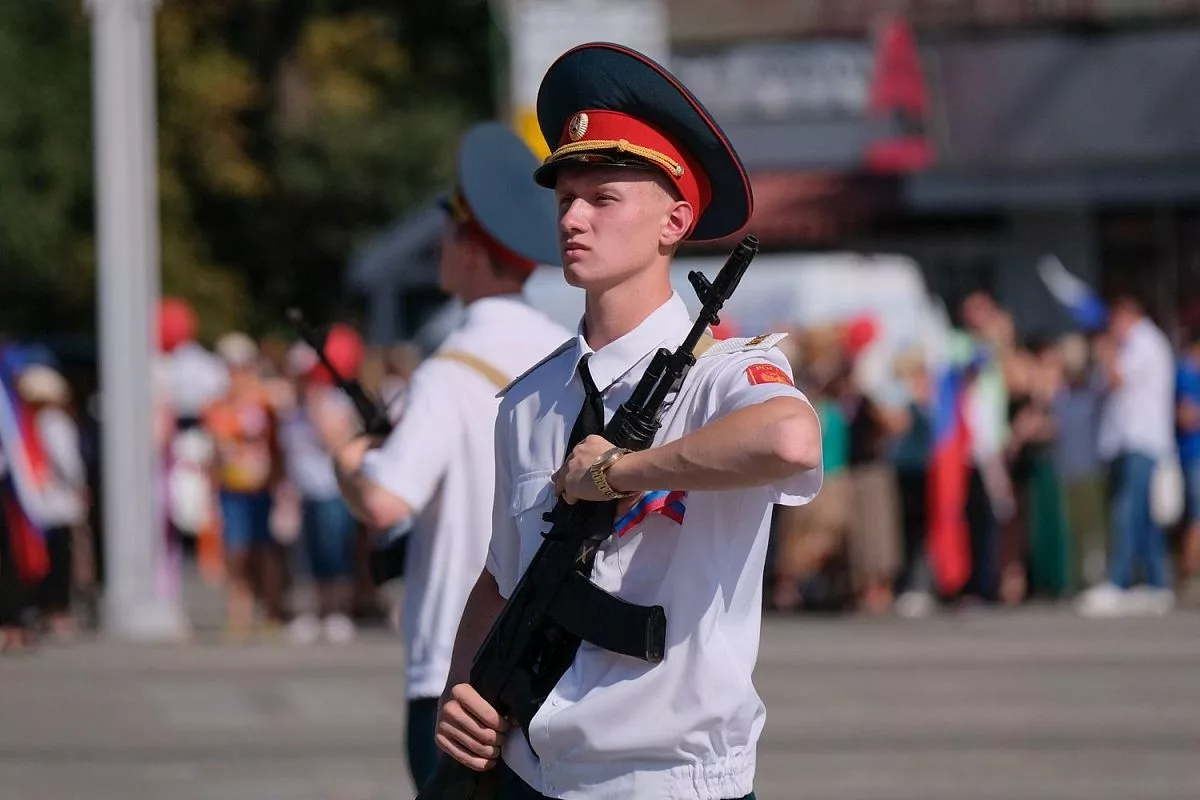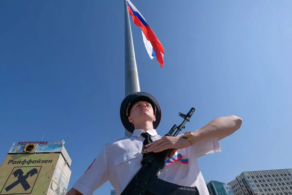 Мероприятие началось с выноса Государственного флага Российской Федерации - под звуки марша в исполнении военного оркестра триколор подняли на флагштоке.
