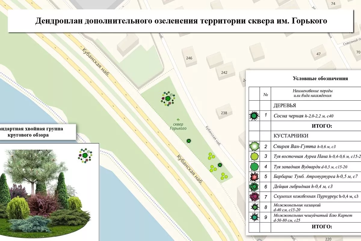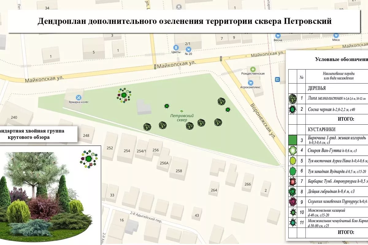 Предполагается высадка 177 деревьев и около 800 кустарников. С дендропланом каждой зеленой зоны можно ознакомиться ниже.