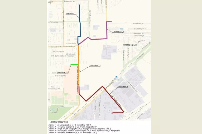 Коллектор планируется проложить по территории ЖК «Легенда», по ул. им. Героя Владислава Посадского, затем вдоль ул. Тихорецкой и далее по ул. 4-й Тихорецкий проезд. Вблизи Комсомольского микрорайона новый коллектор будет врезан в существующую канализационную сеть. Протяженность коллектора составит 5,7 километров. Он будет включать три канализационные насосные станции и локальные очистные сооружения.