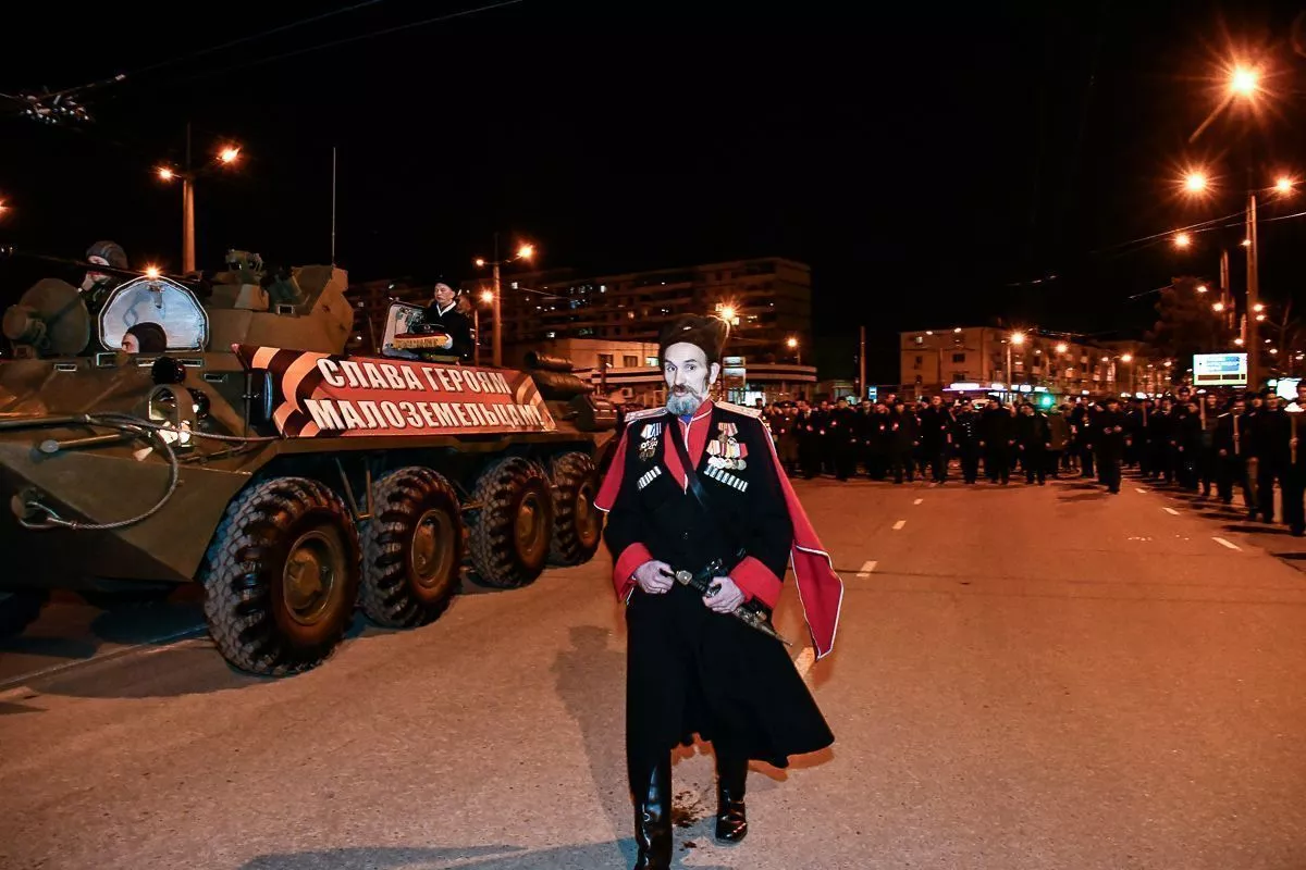 Шествие началось от памятника «Передний край линии обороны Малой земли», где состоялись историческая реконструкция высадки десанта под командованием Цезаря Куникова на Малую землю и митинг памяти.