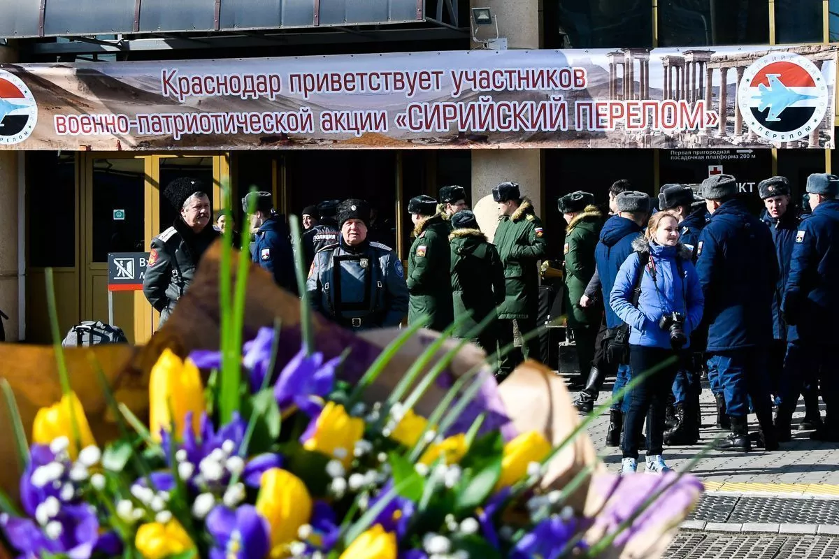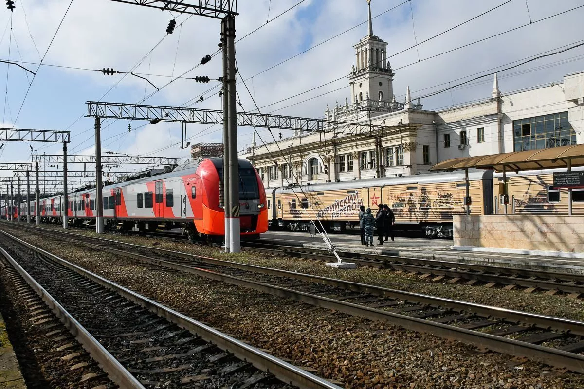 Спецпоезд военно-исторической акции «Сирийский перелом» прибыл на ж/д станцию «Краснодар 1» в 12.30, после чего состоялся митинг.