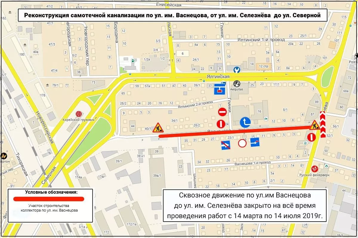 Движение автомобилей будет закрыто с 14 марта по 14 июля на участке улицы Васнецова от Селезнева до Северной.