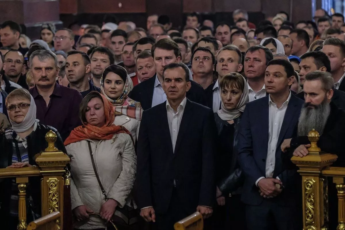 Вместе с прихожанами Пасхальную Божественную литургию в Екатерининском кафедральном соборе, которую провел митрополит Екатеринодарский и Кубанский Исидор, посетили губернатор Кубани Вениамин Кондратьев и глава Краснодара Евгений Первышов.