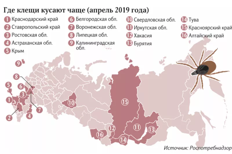 По данным Роспотребнадзора, начало сезона активности клещей в 2019 году зарегистрировали в Южном федеральном округе еще в январе-феврале. Первые укусы были отмечены в Республике Крым, Краснодарском и Ставропольском краях. А в апреле клещи проснулись уже в 16 регионах: добавились Астраханская, Ростовская, Белгородская, Воронежская, Липецкая, Калининградская, Свердловская, Иркутская области, Хакасия, Бурятия, Тыва, Красноярский и Алтайский края.