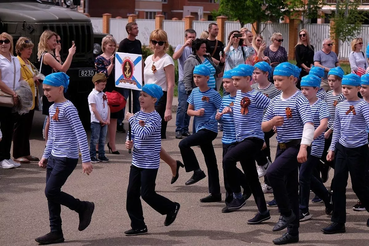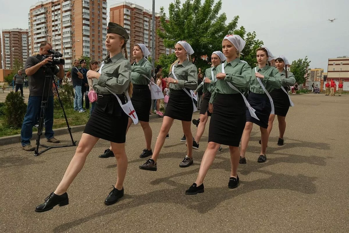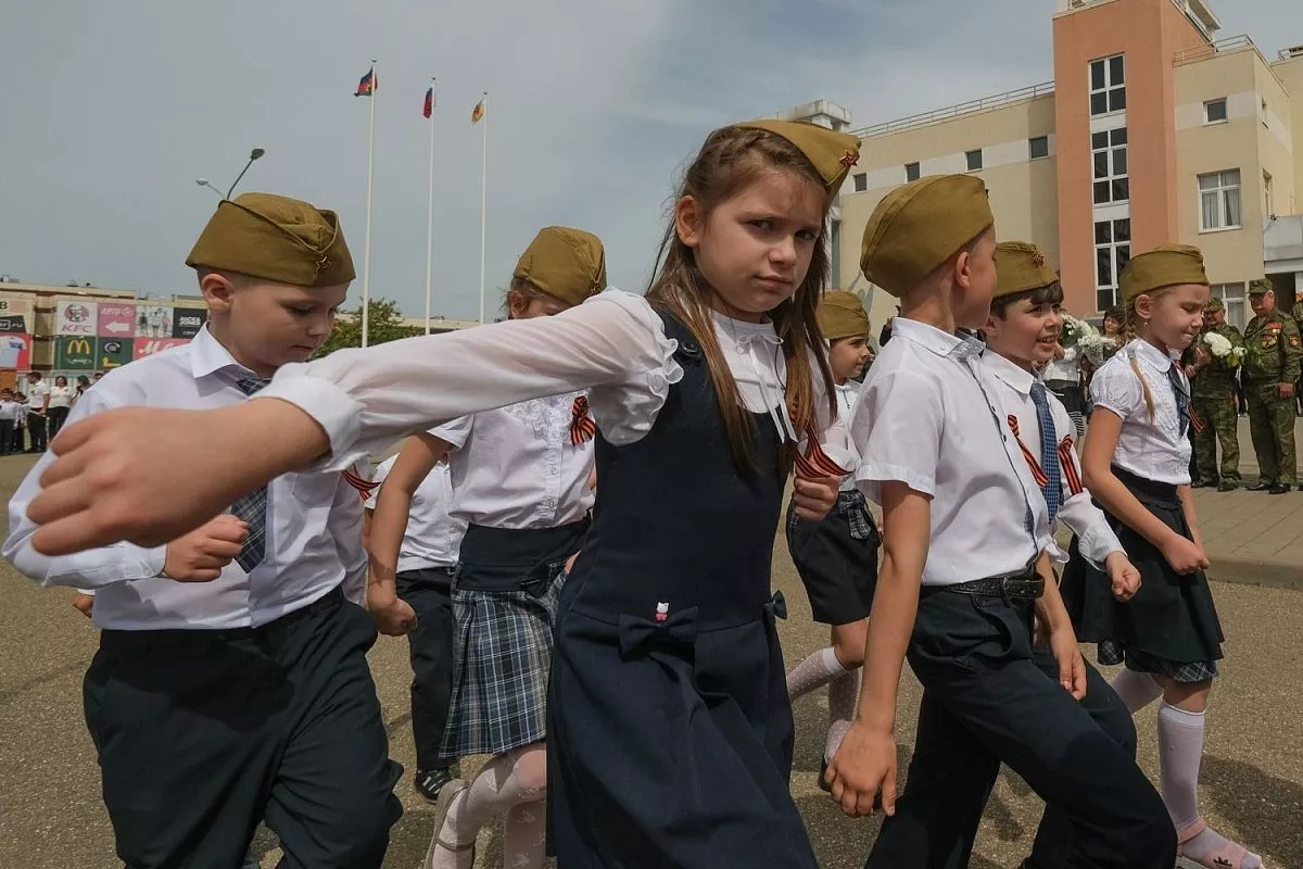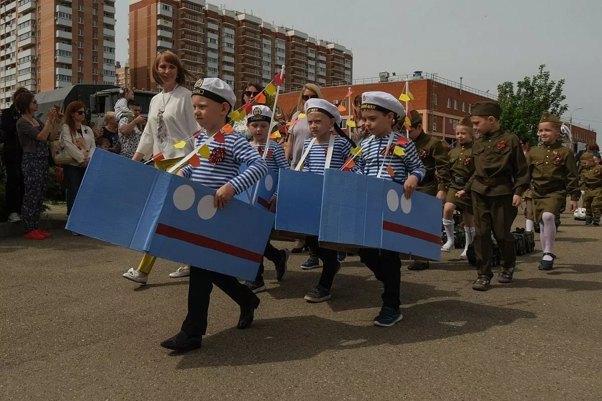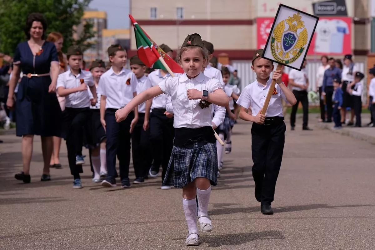 Перед ветеранами Великой Отечественной войны и Вооруженных сил и участниками локальных войн торжественным маршем прошли более тысячи детей - ученики школы № 98, кадеты Краснодарского президентского кадетского училища, воспитанники детского сада № 100, юнармейцы. По школьному плацу, чеканя шаг, шли юные пехотинцы и моряки, артиллеристы и военная разведка, летчики и танкисты.