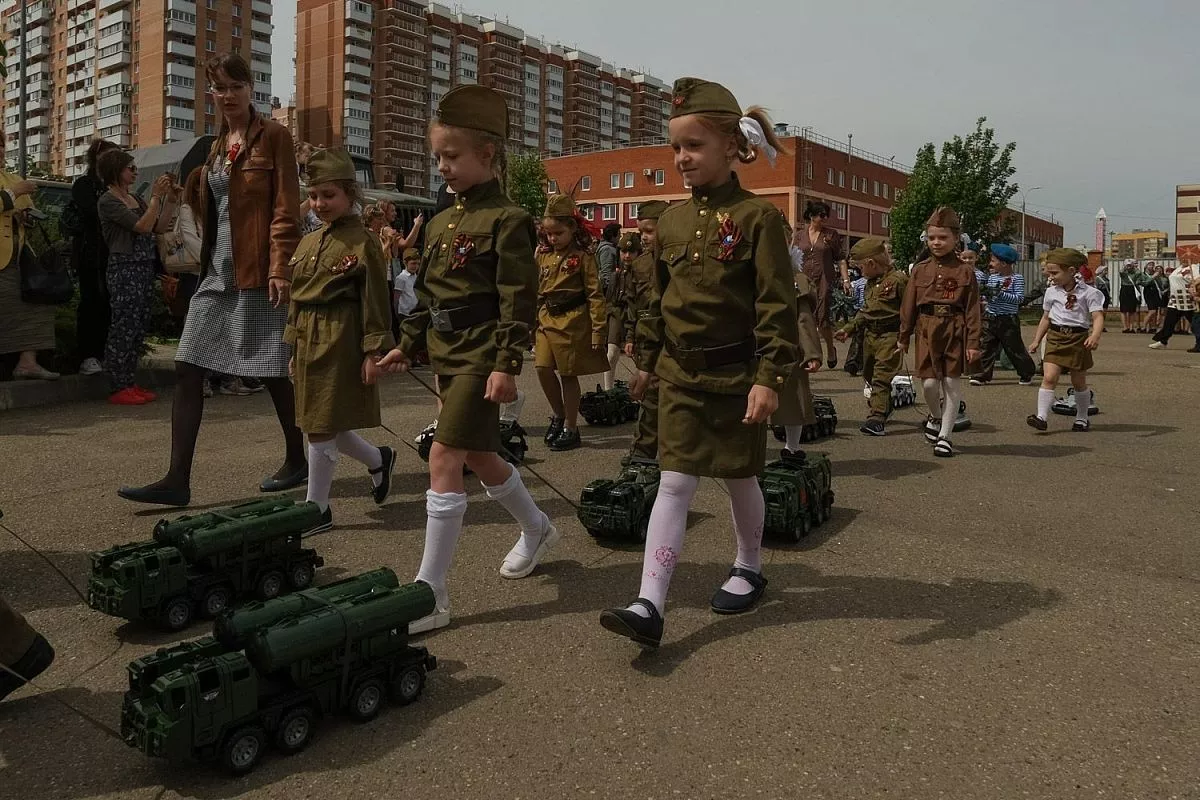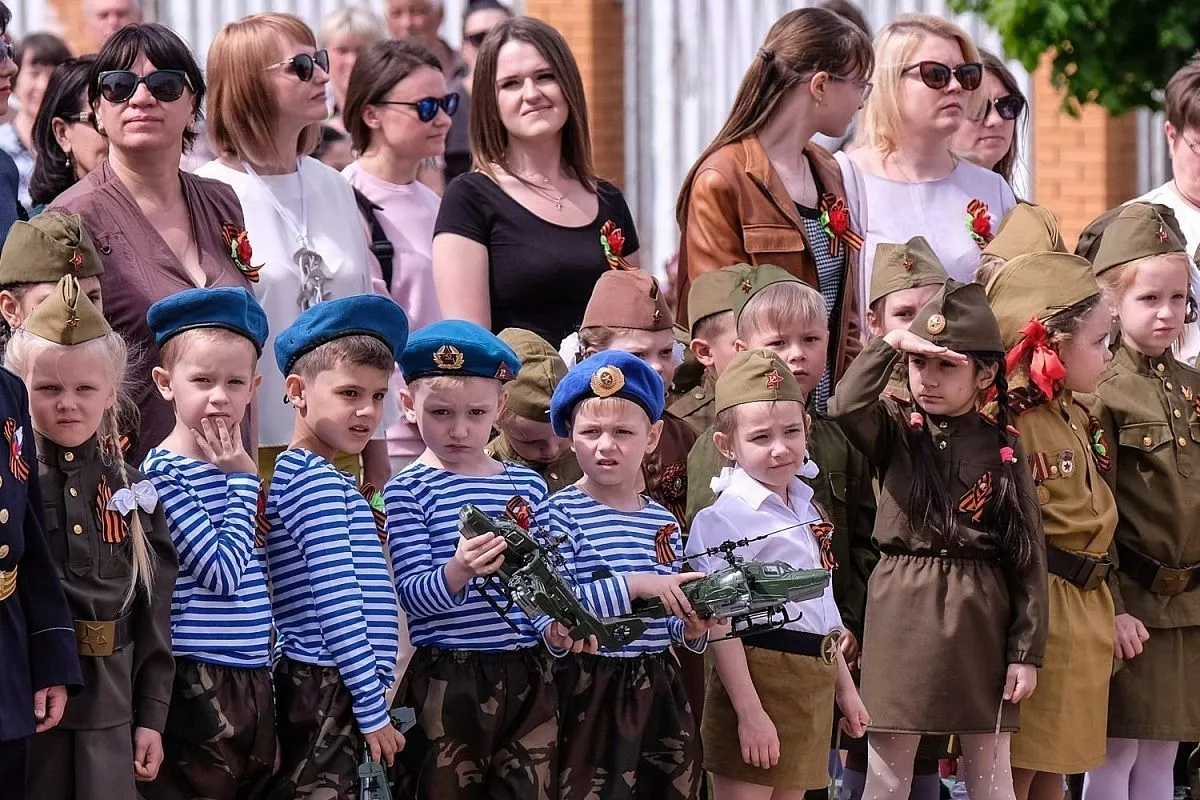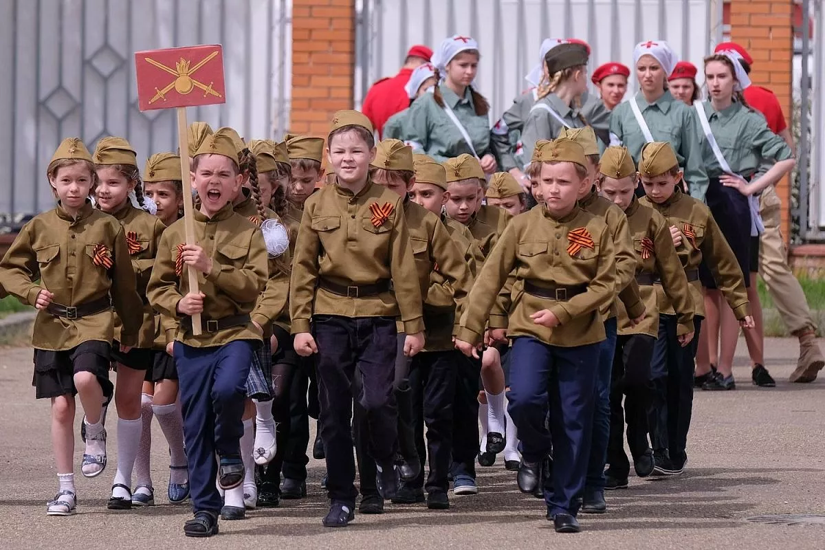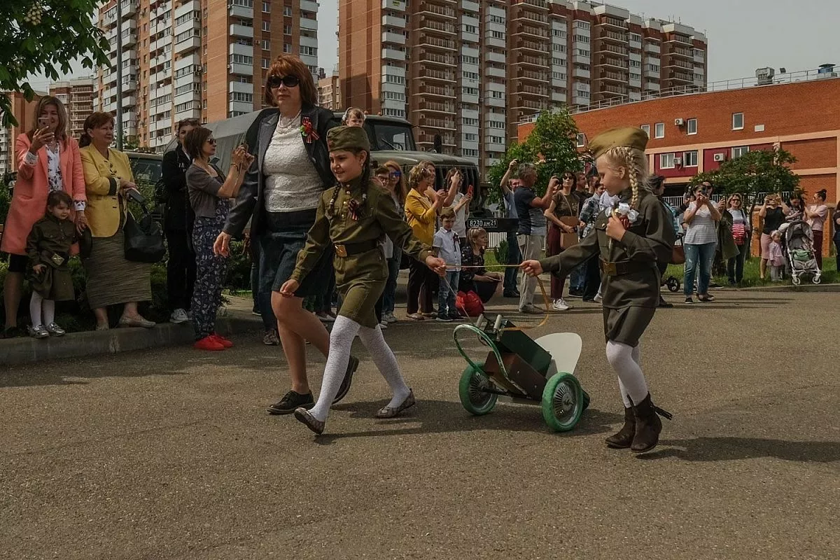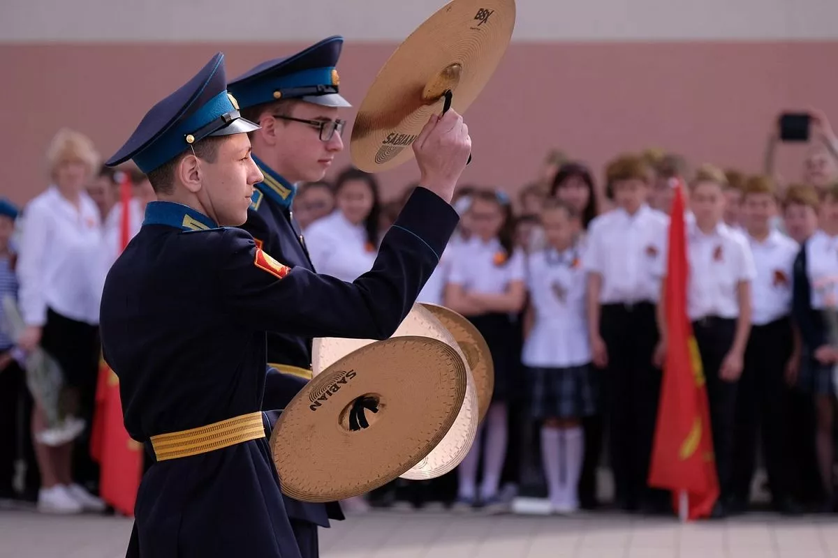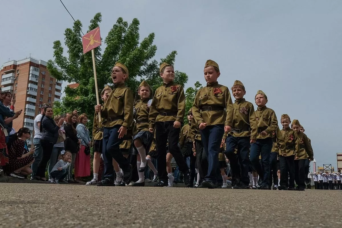 Перед ветеранами Великой Отечественной войны и Вооруженных сил и участниками локальных войн торжественным маршем прошли более тысячи детей - ученики школы № 98, кадеты Краснодарского президентского кадетского училища, воспитанники детского сада № 100, юнармейцы. По школьному плацу, чеканя шаг, шли юные пехотинцы и моряки, артиллеристы и военная разведка, летчики и танкисты.