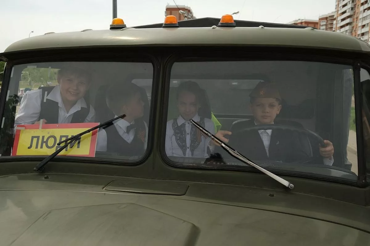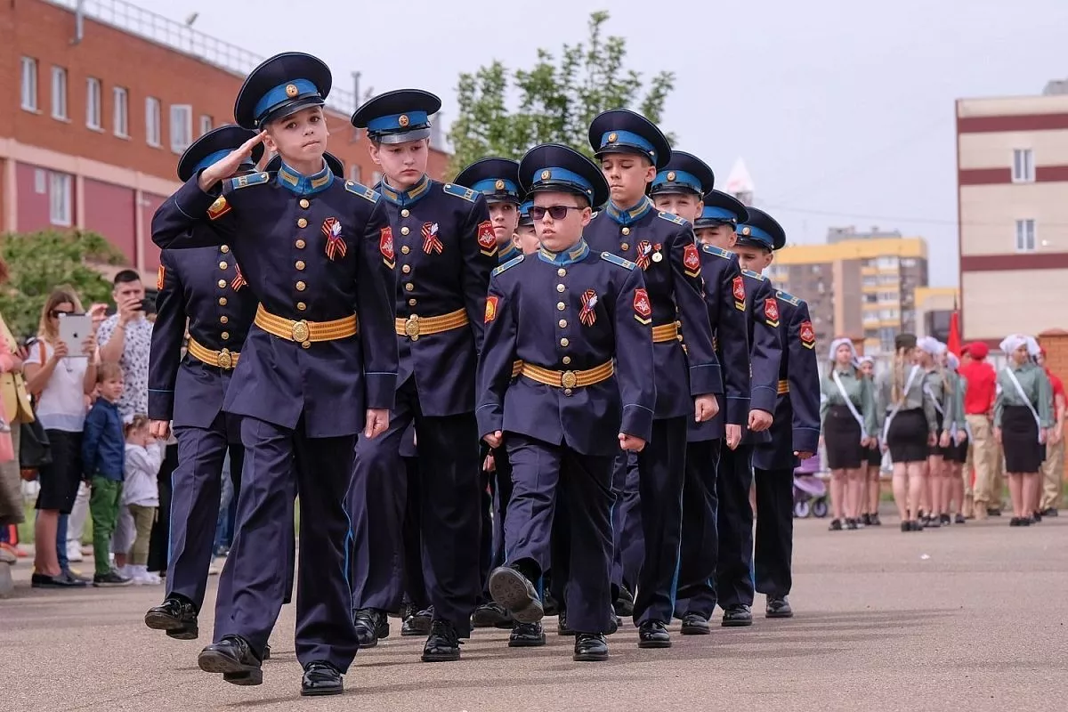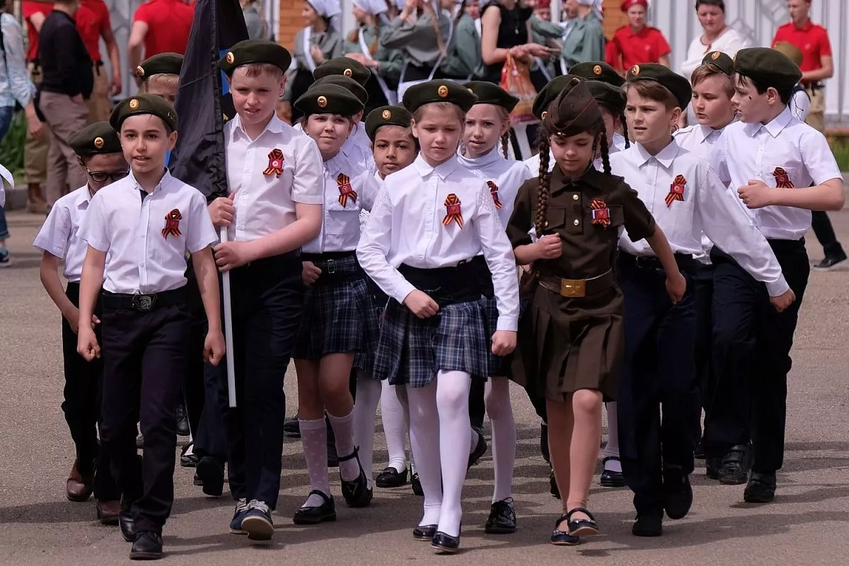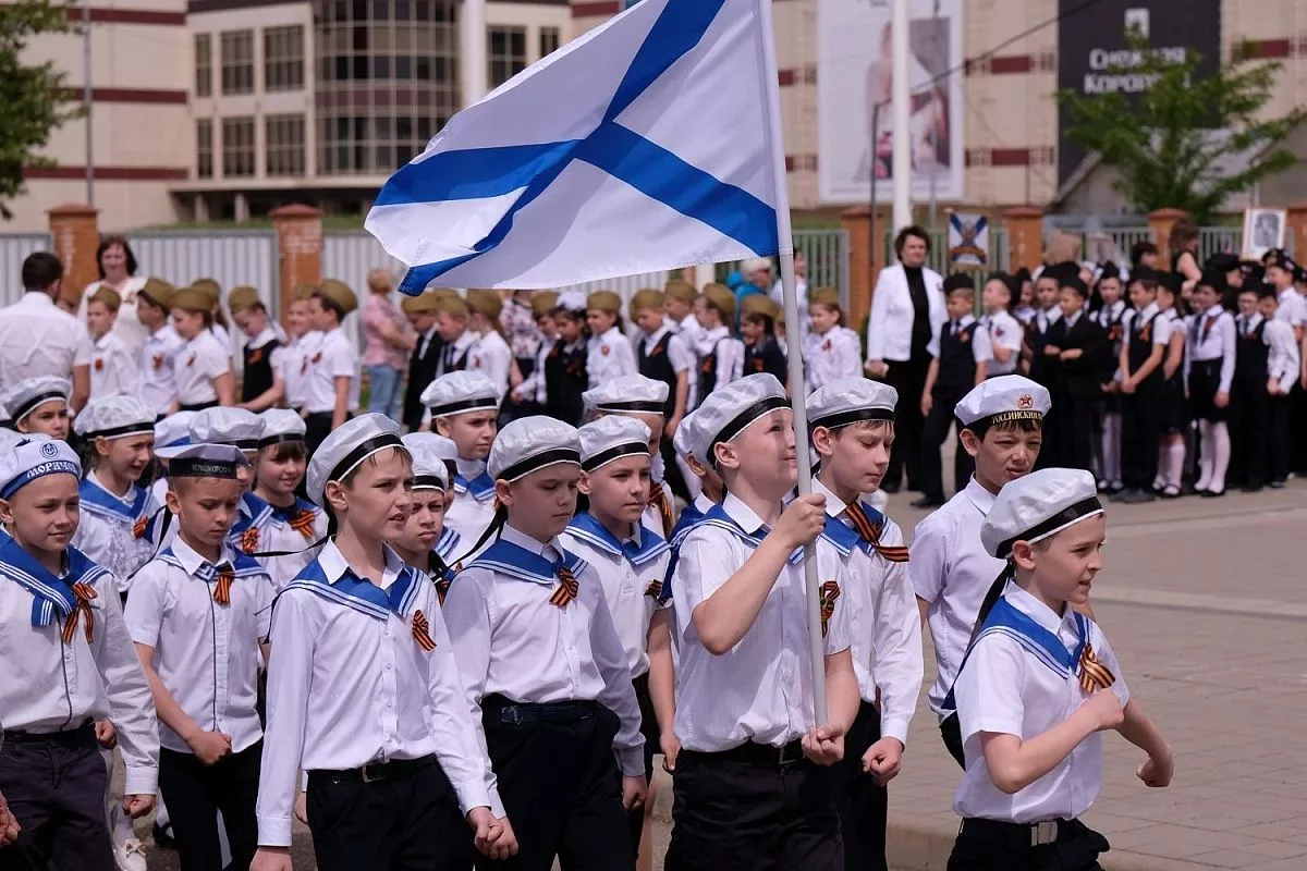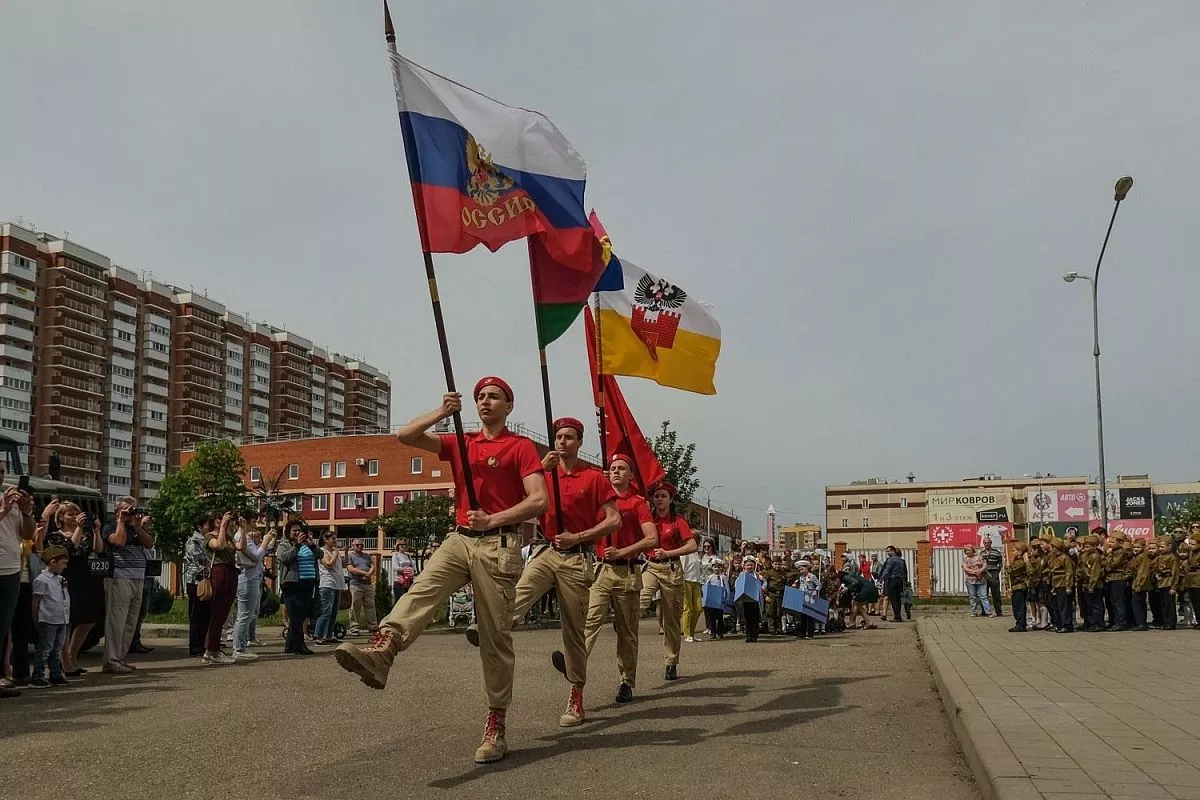 Перед ветеранами Великой Отечественной войны и Вооруженных сил и участниками локальных войн торжественным маршем прошли более тысячи детей - ученики школы № 98, кадеты Краснодарского президентского кадетского училища, воспитанники детского сада № 100, юнармейцы. По школьному плацу, чеканя шаг, шли юные пехотинцы и моряки, артиллеристы и военная разведка, летчики и танкисты.