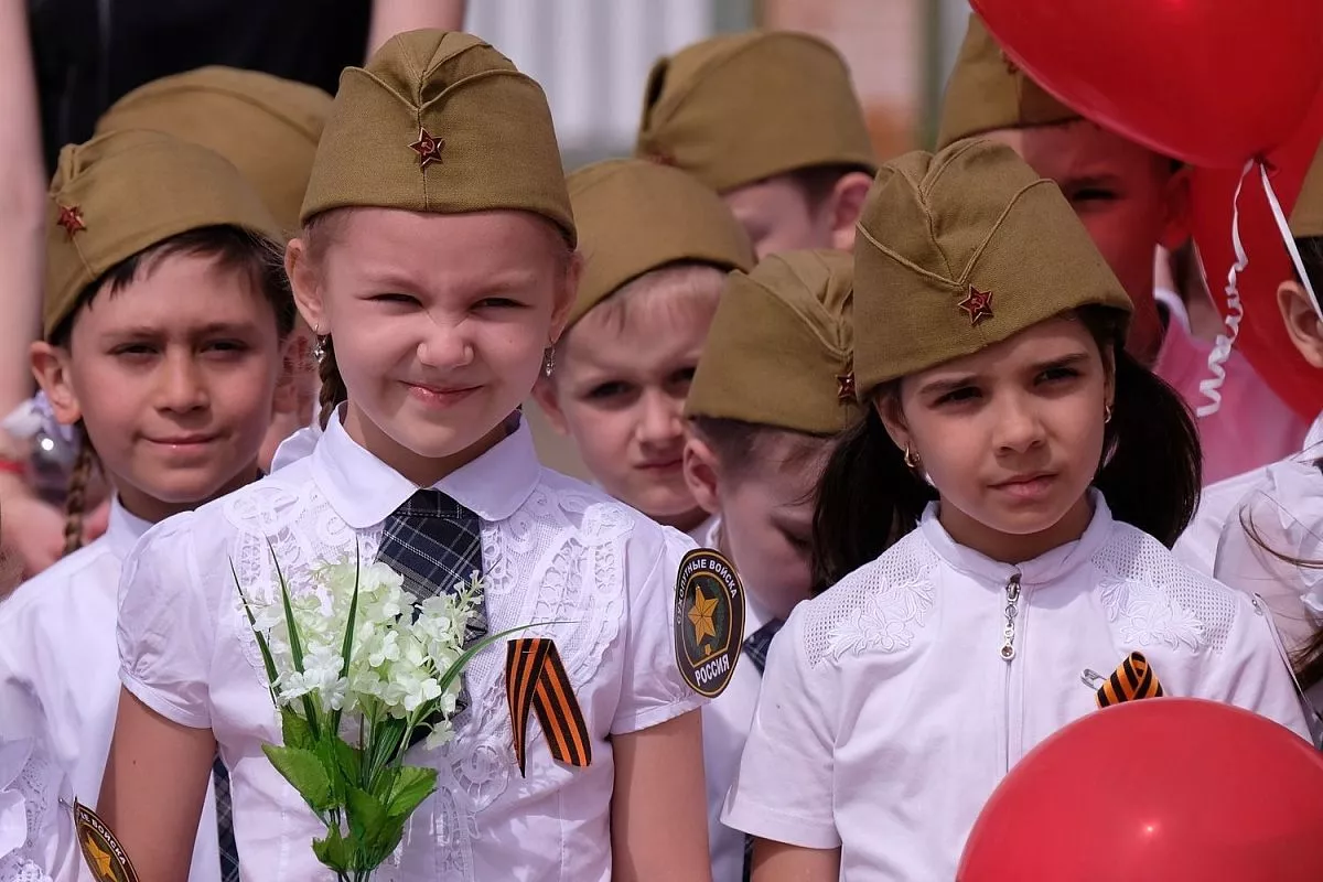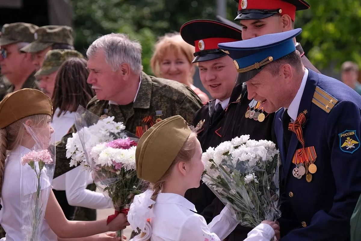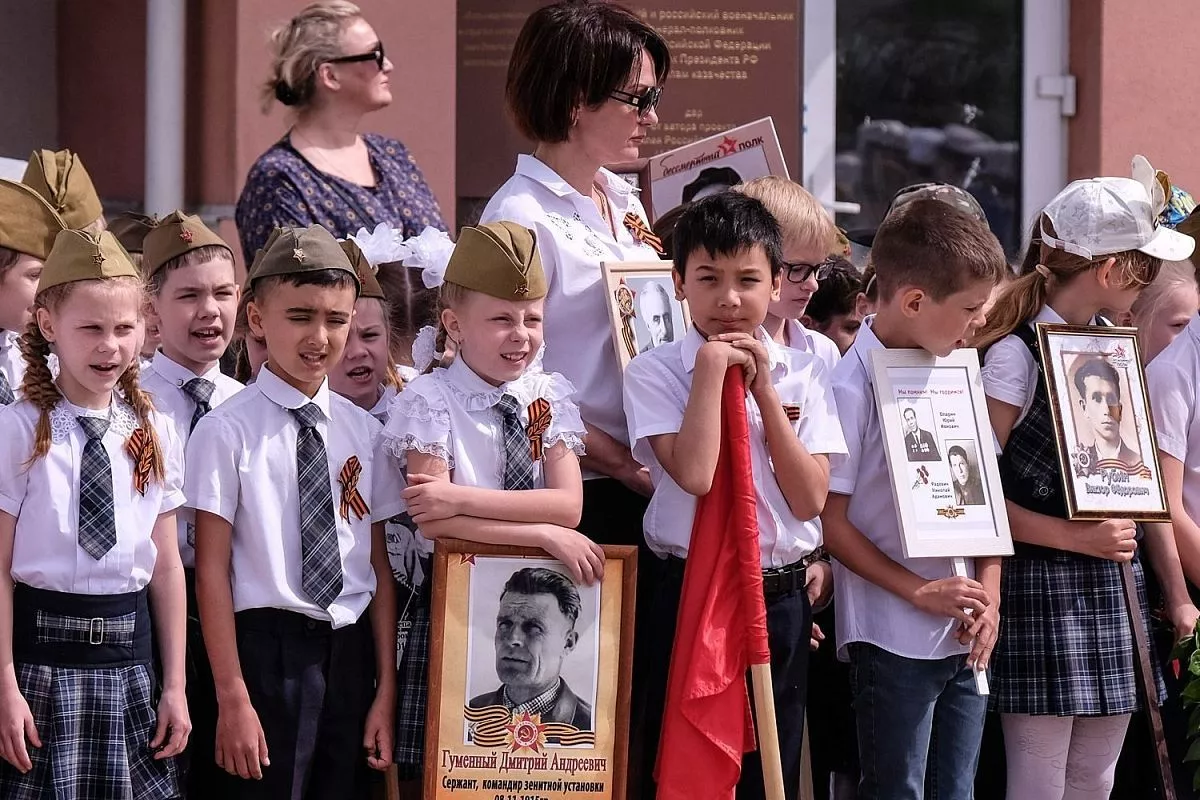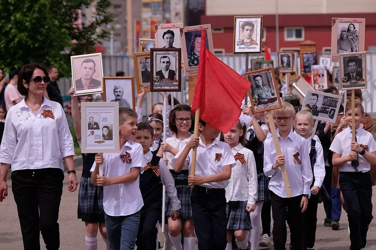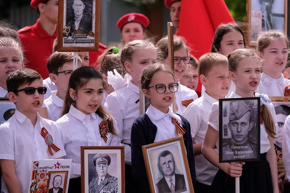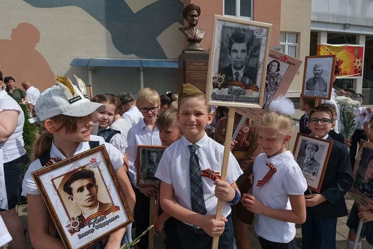 Перед ветеранами Великой Отечественной войны и Вооруженных сил и участниками локальных войн торжественным маршем прошли более тысячи детей - ученики школы № 98, кадеты Краснодарского президентского кадетского училища, воспитанники детского сада № 100, юнармейцы. По школьному плацу, чеканя шаг, шли юные пехотинцы и моряки, артиллеристы и военная разведка, летчики и танкисты.