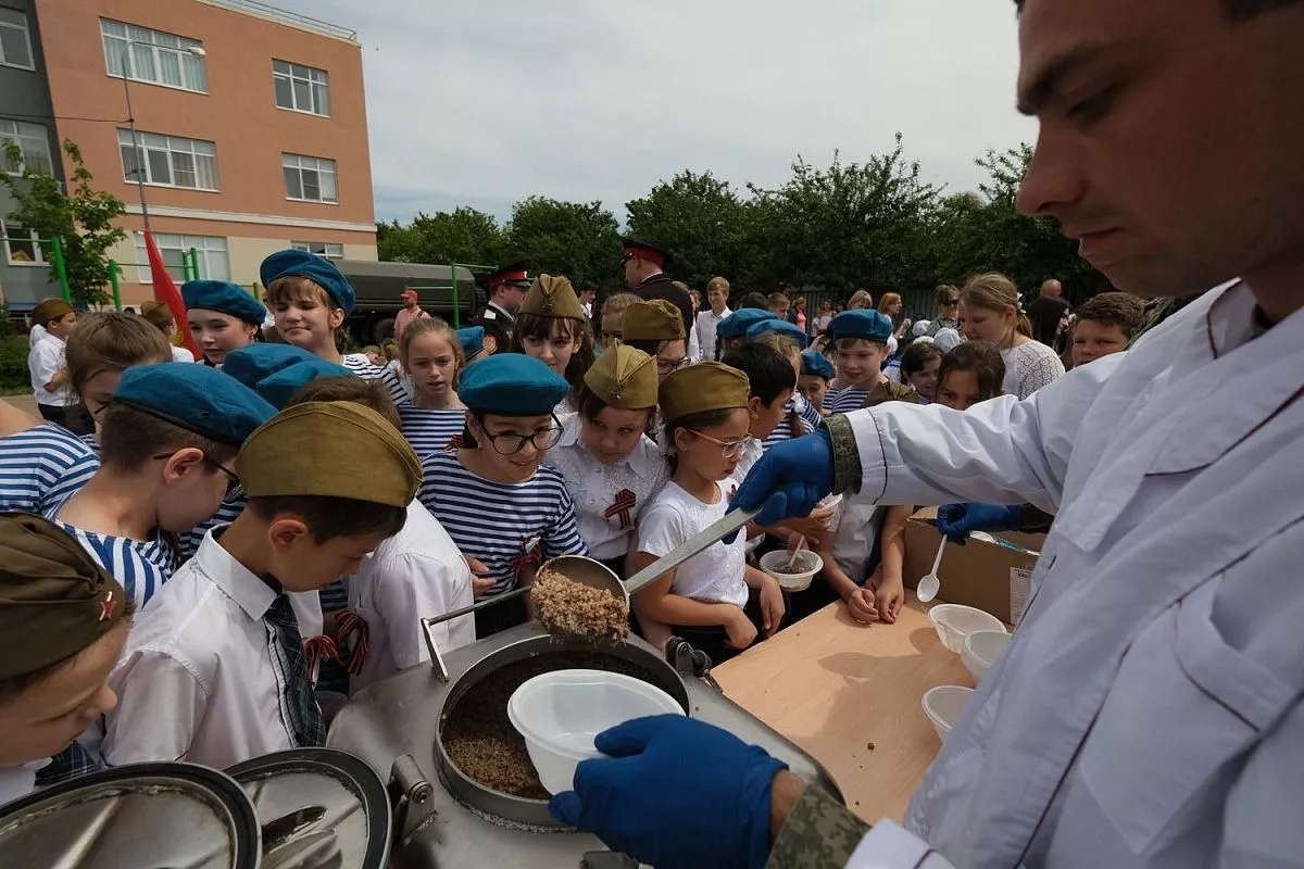 Ребята показали свою выправку в строю, а после парадного прохода всех участников ждала настоящая армейская каша и выставка военной техники и оружия из Выставочного зала боевой славы Краснодара.